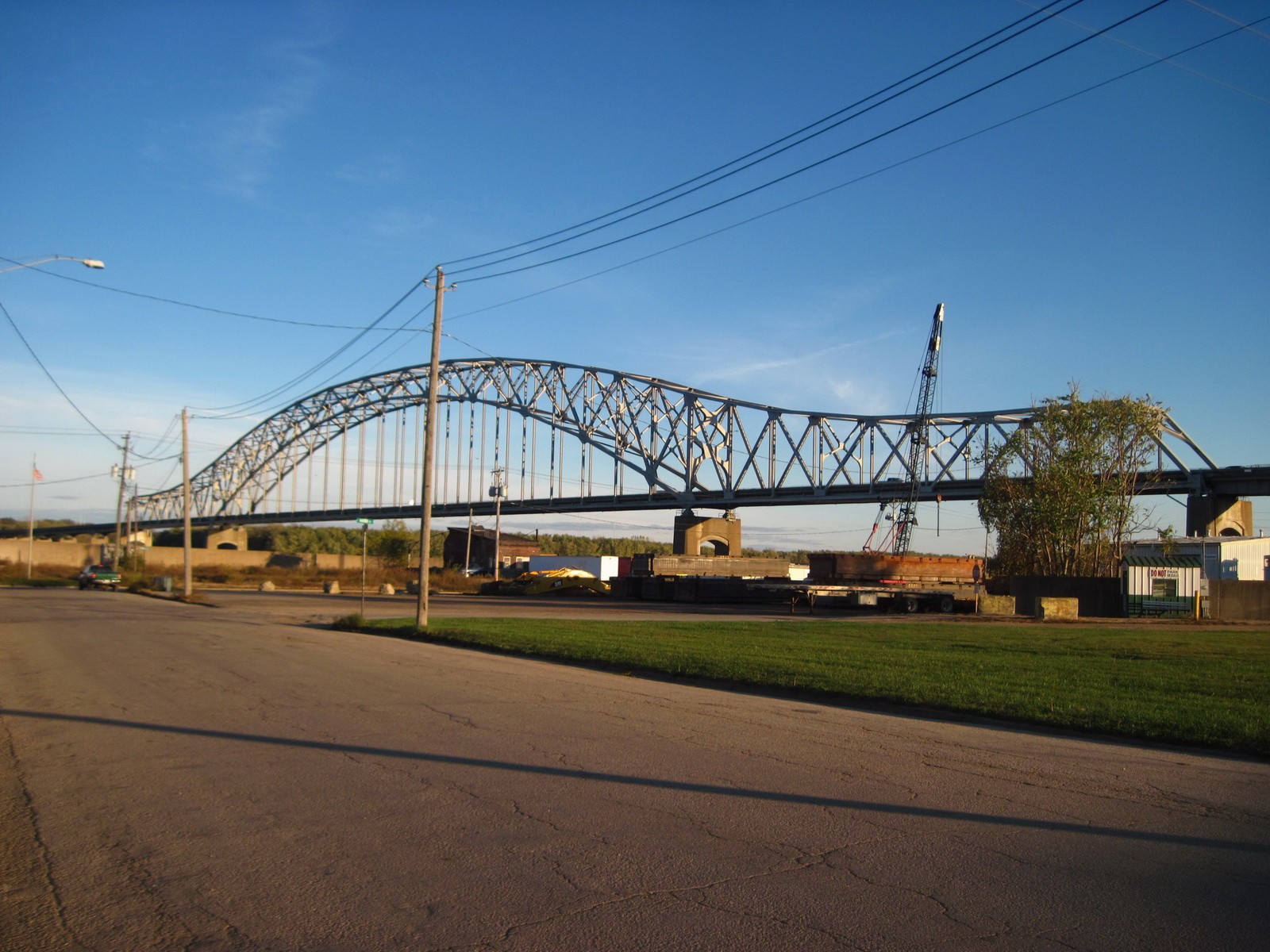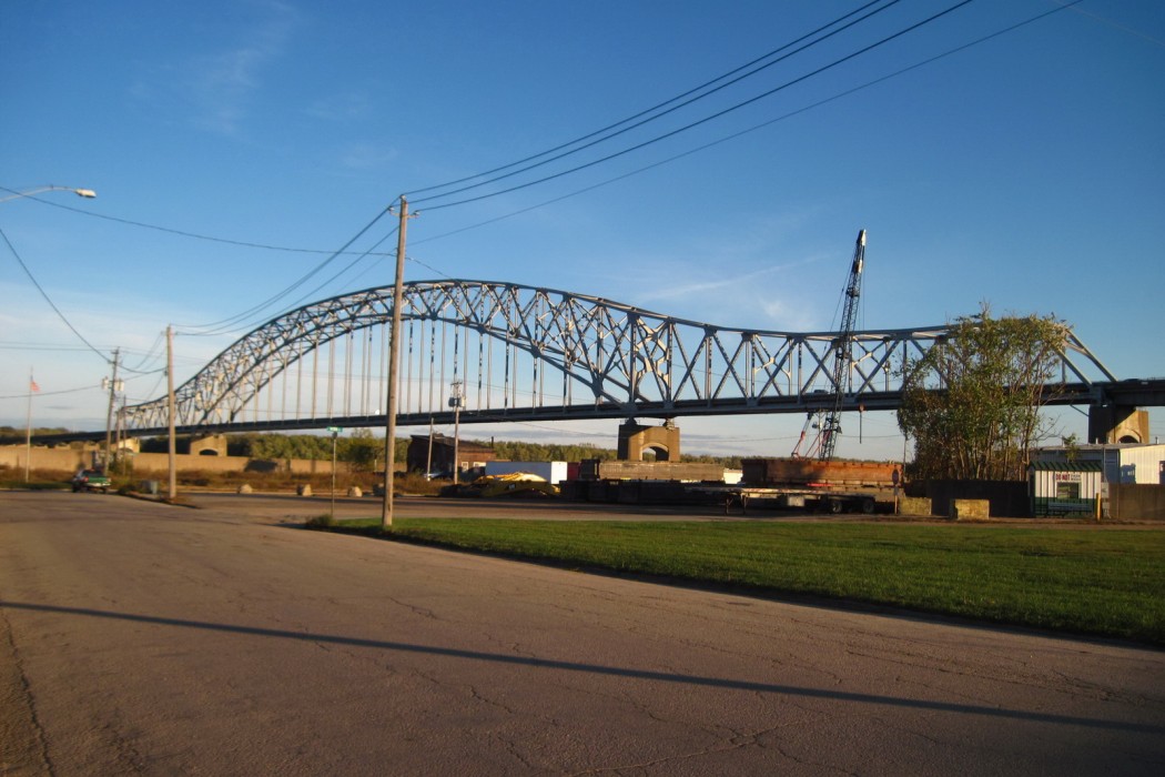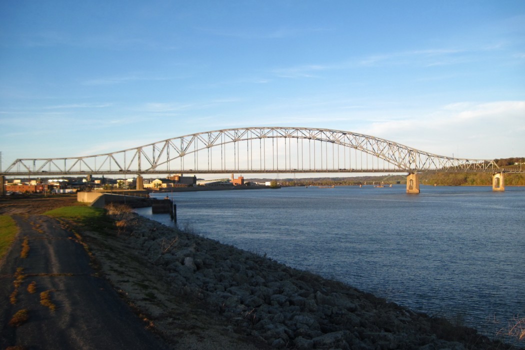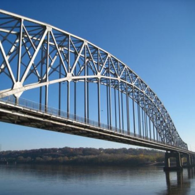 The 5,635-foot-long Julien Dubuque Bridge carries two lanes of U.S. 20 over the Mississippi River between East Dubuque, Illinois, and Dubuque, Iowa. The east approach consists of twenty-three two-girder spans that are 2,773 feet long. The main structure is a 1,539-foot-long continuous three-span arch truss. The west approach consists of six multi-beam spans, measuring 387 feet long, and seven two-girder spans, measuring 936 feet long. The riveted structure was built in 1943 and has been modified several times.