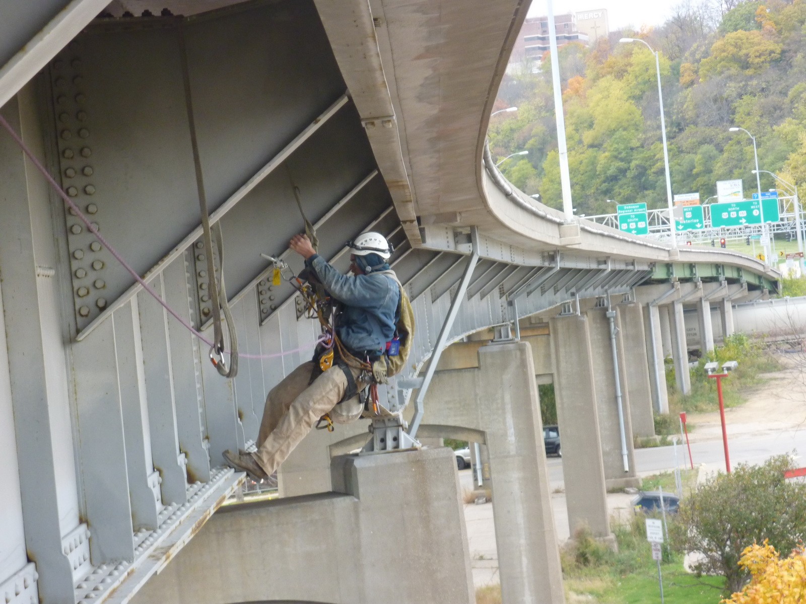 WJE engineers utilized industrial rope access techniques to perform in-depth condition surveys of the steel superstructure, including documentation of section loss, as well as an arm's length examination of non-redundant bridge elements subject to tension, including vertical and diagonal truss chords, tie girders, hangers, riveted plate girders, and floor beams. The engineers also conducted routine condition surveys of all substructure elements located above the ground or water line. As part of the surveys, all bearings were observed, and the positions of expansion bearings were measured.