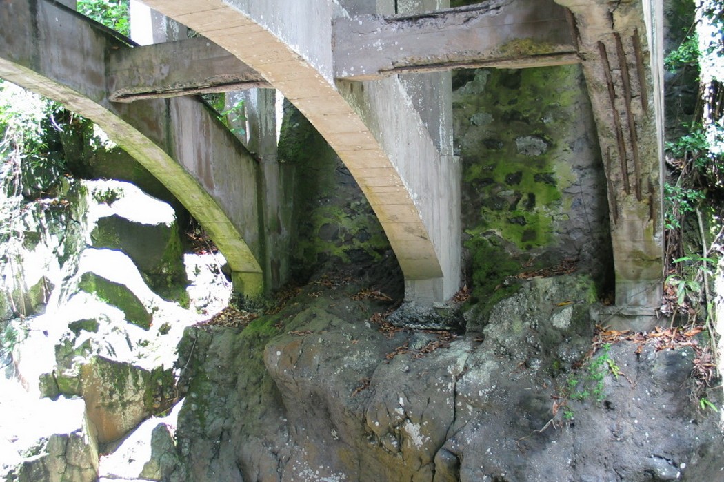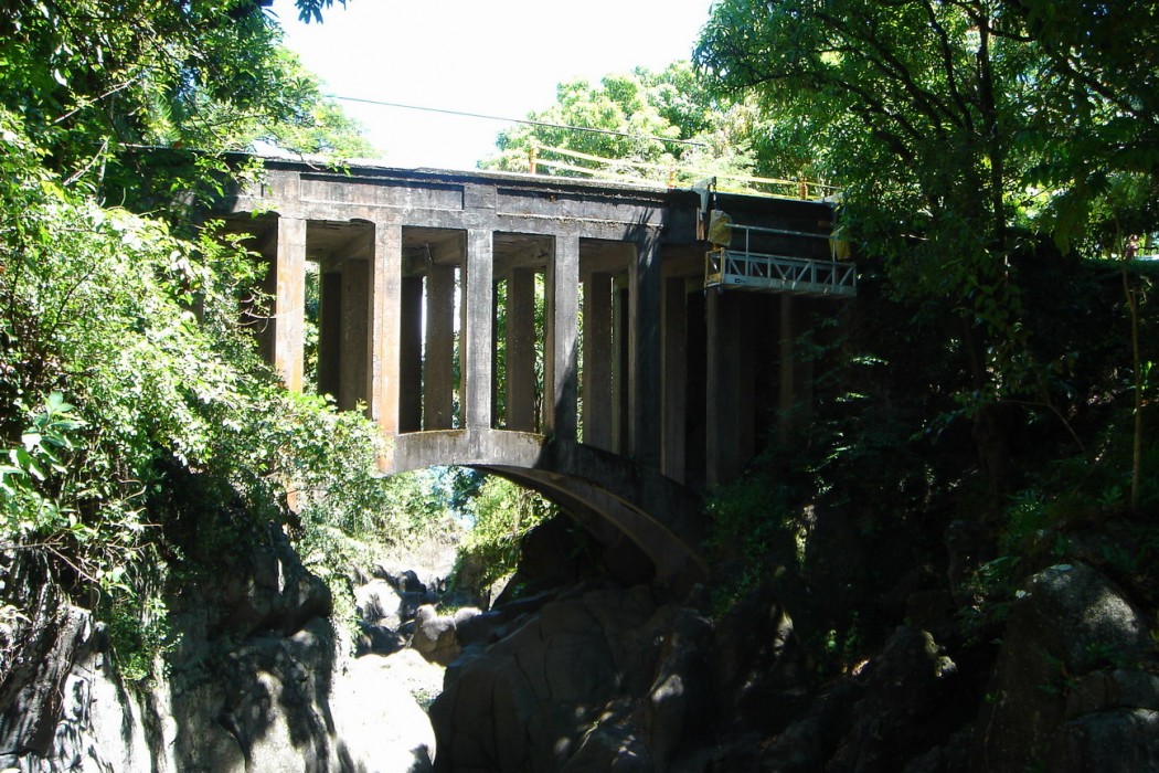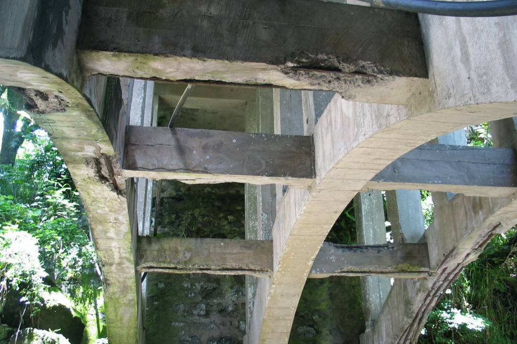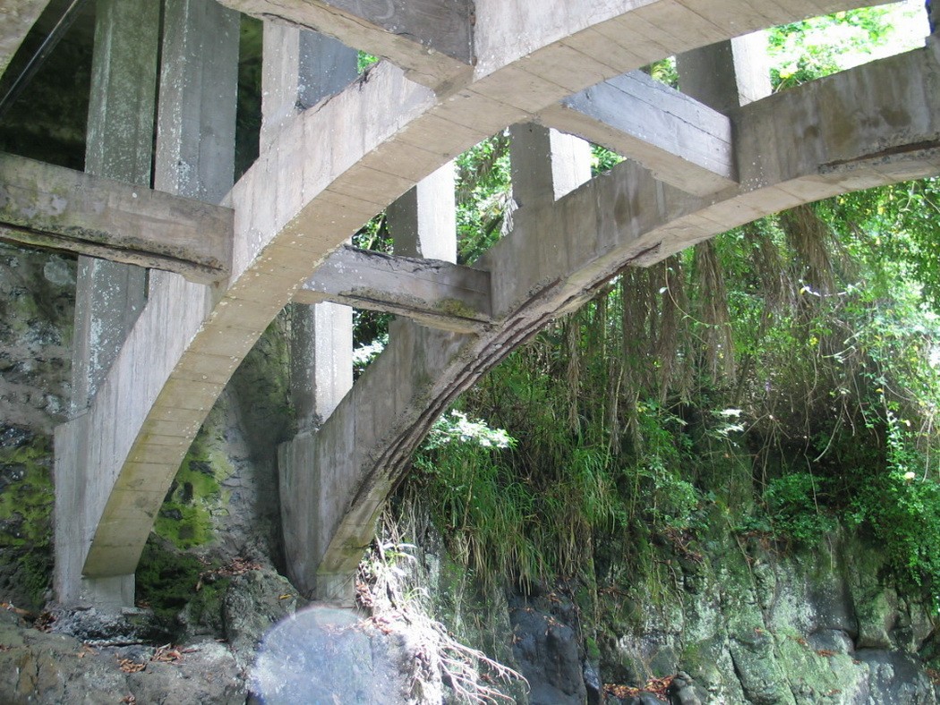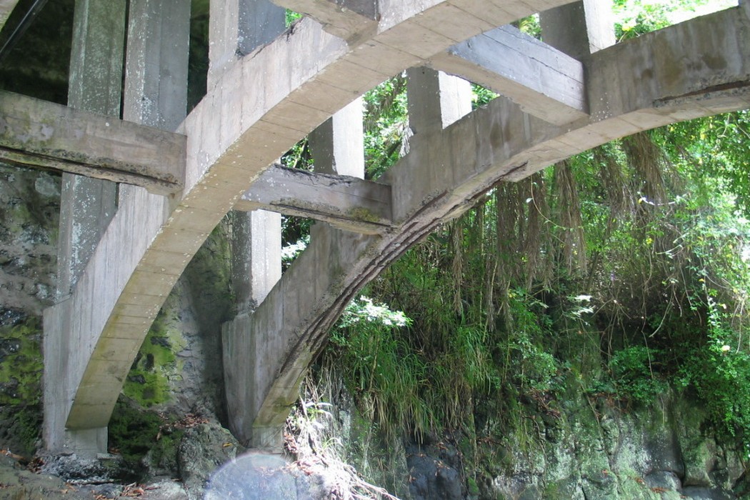 The Koukouai Bridge is located along the Piilani Highway across Koukouai Stream near Hana, Maui and is owned and maintained by the County of Maui. The bridge structure is of cast-in-place, conventionally reinforced concrete with stone masonry retaining walls at each end abutment. The structure comprises three parallel arches that support closely spaced columns and transverse floor beams, with one-way deck slabs spanning in the longitudinal direction between adjacent beam and column bents. The arches bear directly against the exposed rock walls of the gorge.