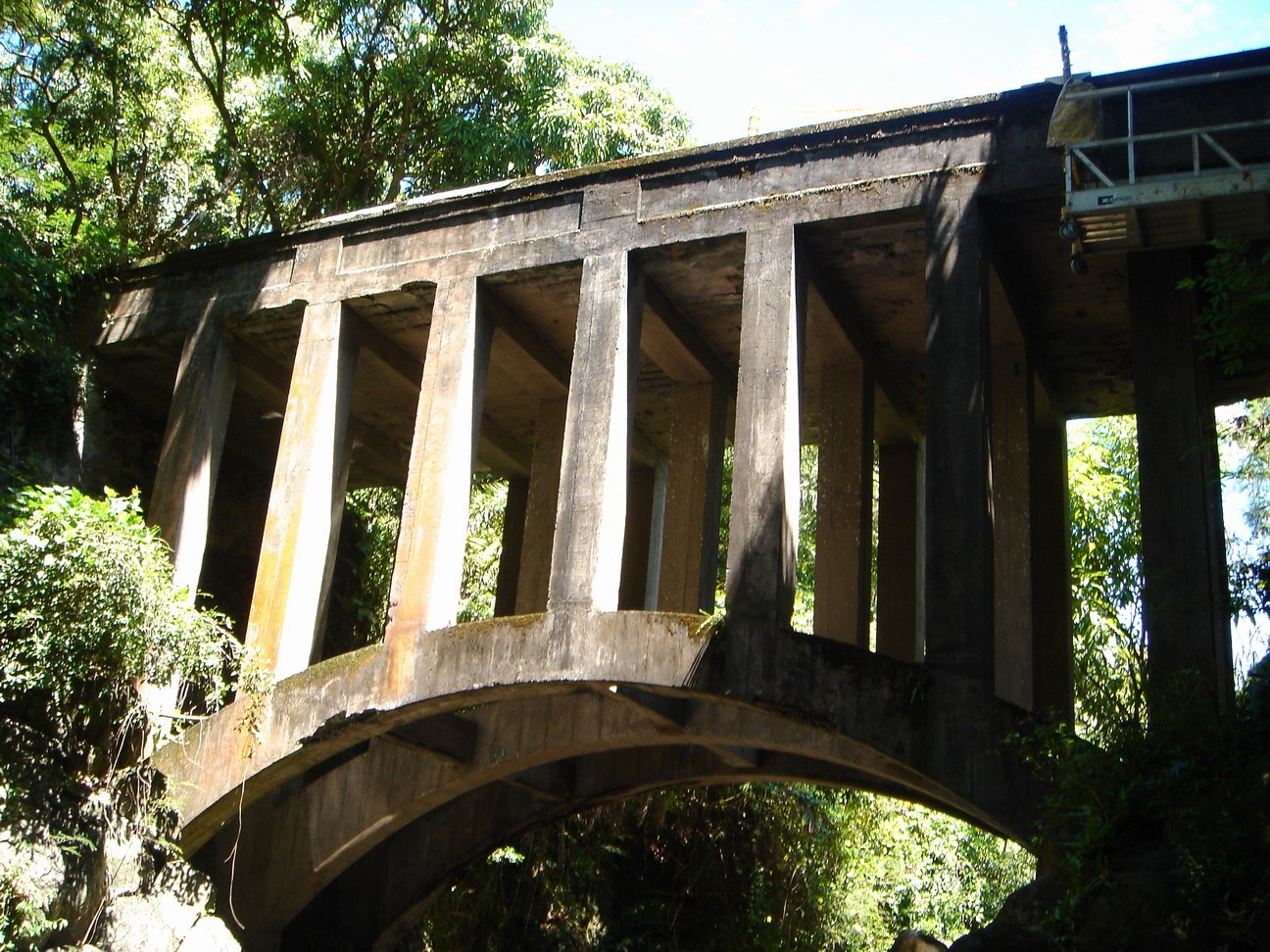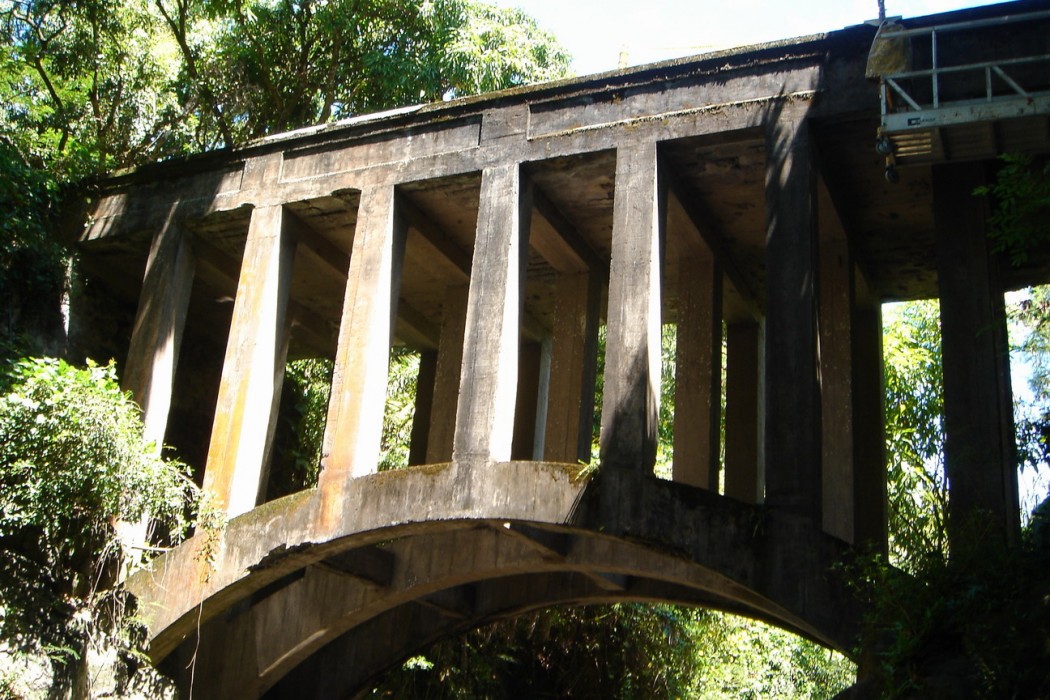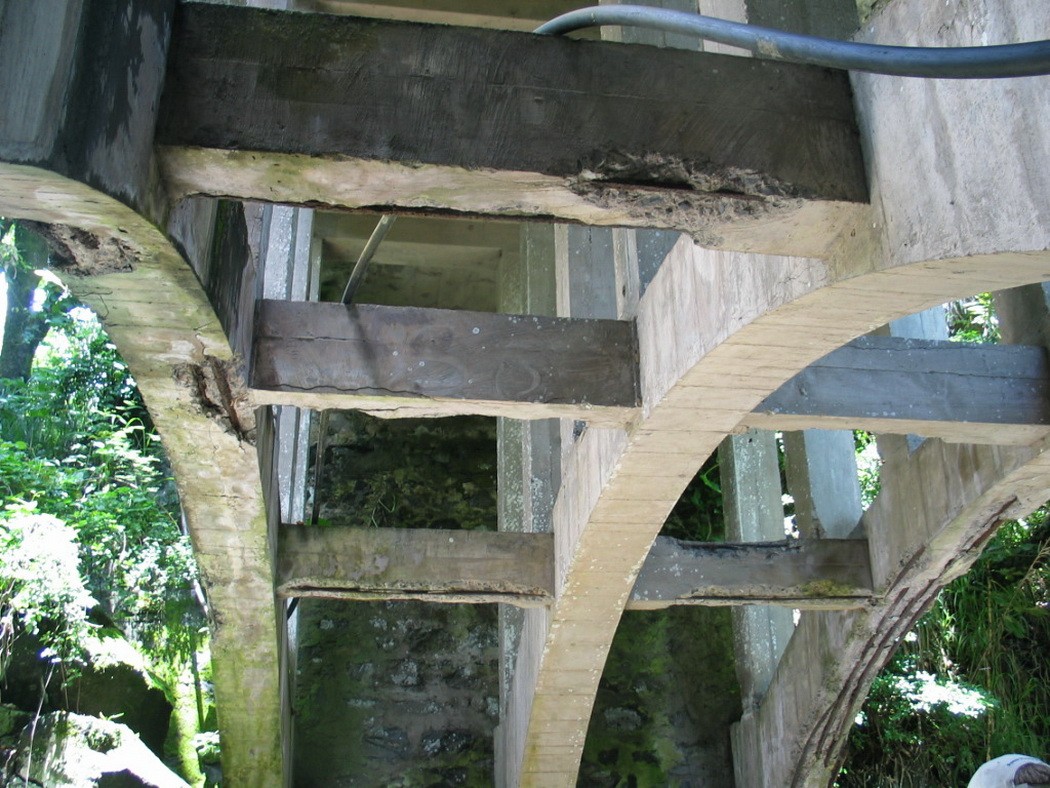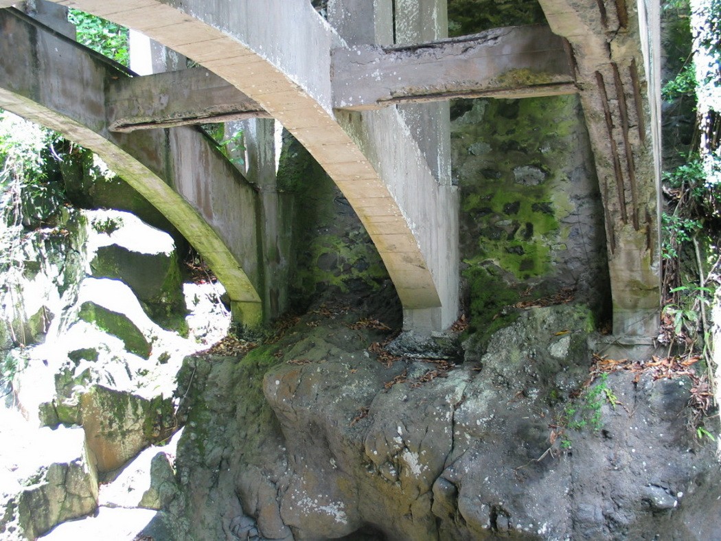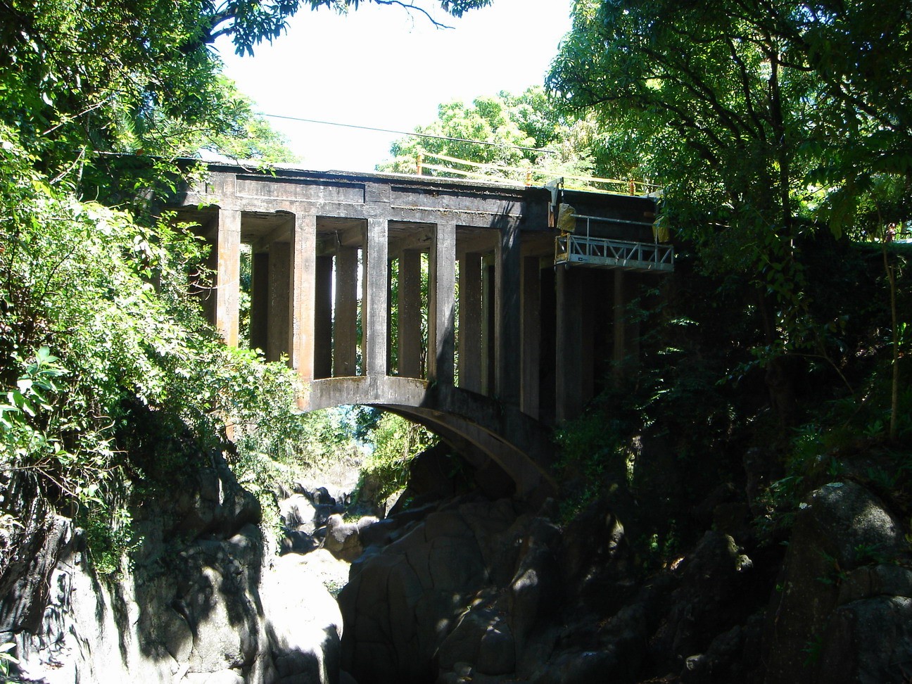 The Koukouai Bridge is located along the Piilani Highway across Koukouai Stream near Hana, Maui and is owned and maintained by the County of Maui. The bridge structure is of cast-in-place, conventionally reinforced concrete with stone masonry retaining walls at each end abutment. The structure comprises three parallel arches that support closely spaced columns and transverse floor beams, with one-way deck slabs spanning in the longitudinal direction between adjacent beam and column bents. The arches bear directly against the exposed rock walls of the gorge.