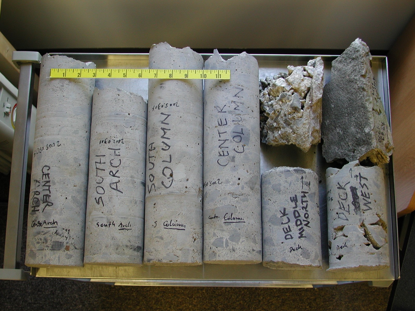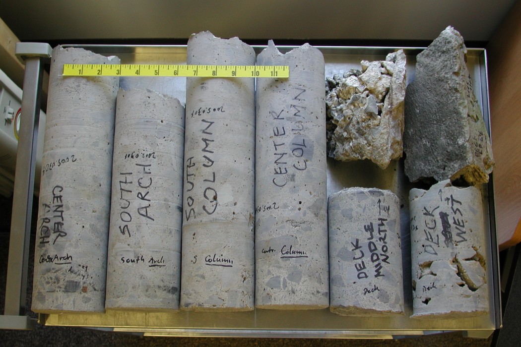 WJE engineers prepared detailed, as-built structural drawings of the bridge, showing structural member dimensions and steel reinforcement. The team performed petrographic studies, chloride profiles, and compressive strength testing on selected concrete samples as well as chemical analyses and tensile strength testing of reinforcing steel samples. The engineers determined that the structural elements sustained significant deterioration, primarily as a result of corrosion of the reinforcing steel. WJE concluded that with properly executed repairs and appropriate protective measures, the useful life of the bridge could be significantly extended.