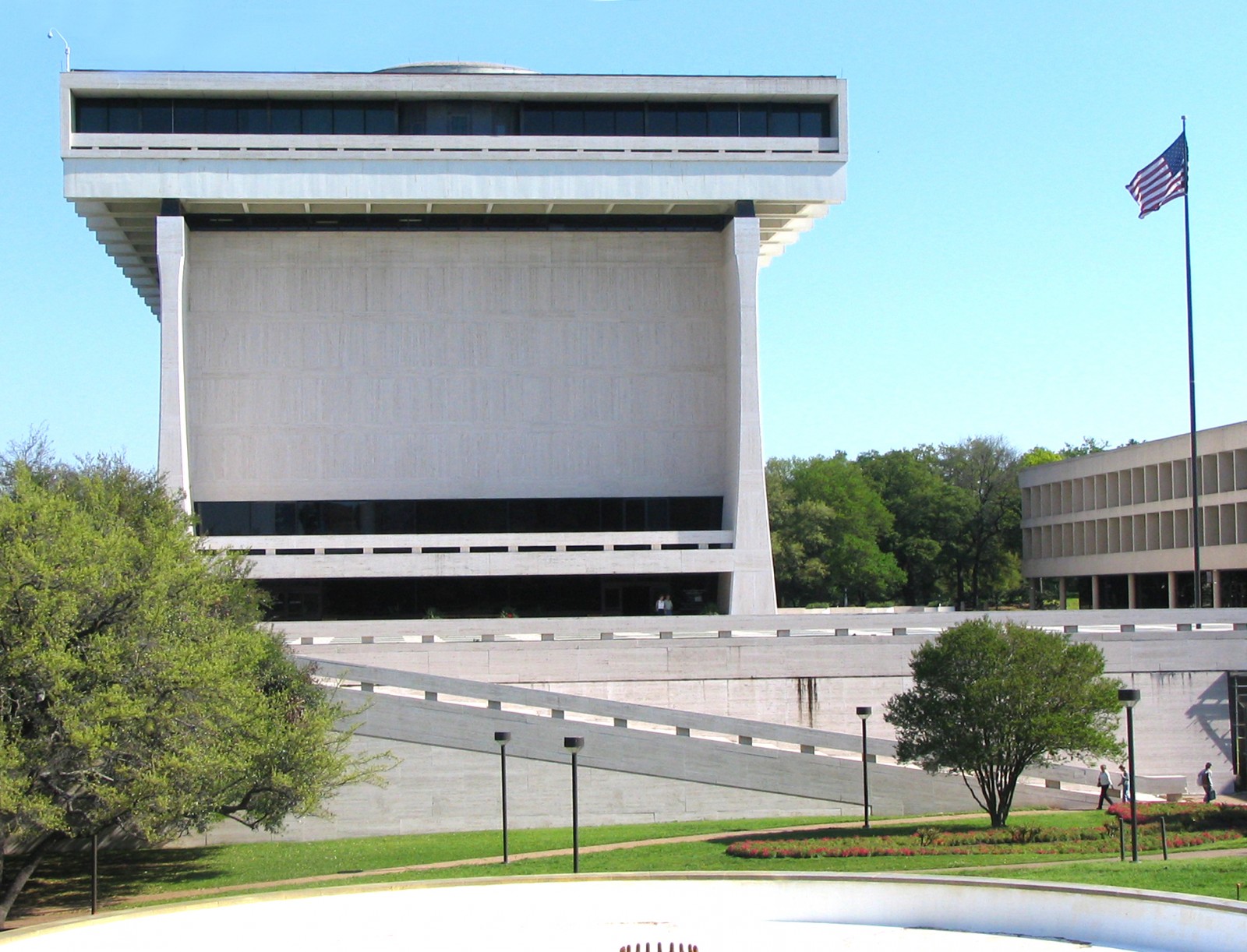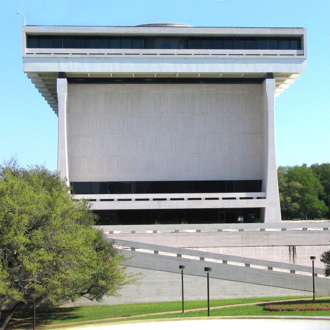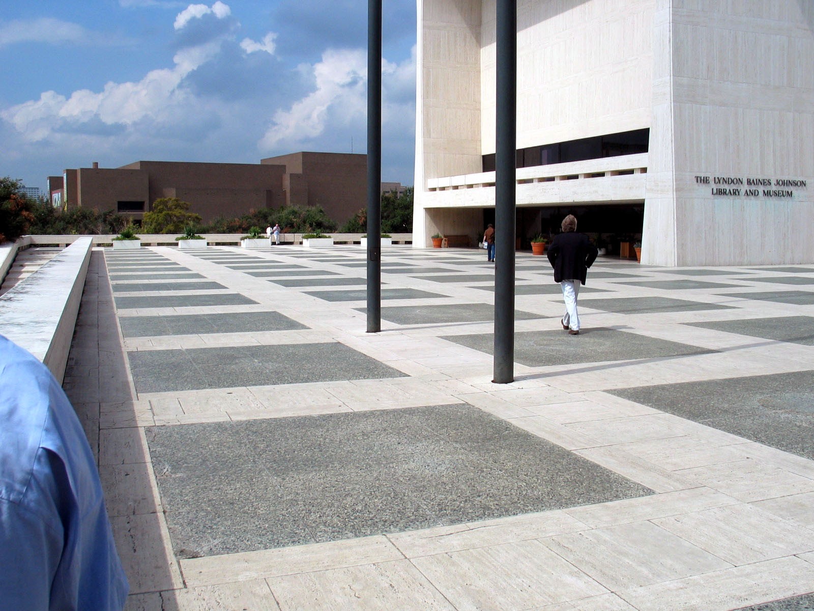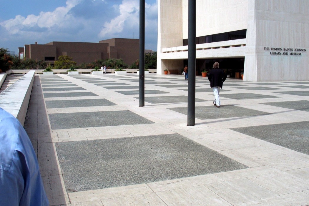 The Lyndon Baines Johnson Library and Museum opened on the University of Texas campus in 1971 as the archival repository for the papers of President Johnson. Designed by Gordon Bunshaft, the ten-story modernist library, which also houses offices and a museum, is clad in travertine. Surrounding the main building is a 90,000-foot travertine and terrazzo plaza supported by four independent structural systems. Beneath the plaza are storage spaces and lecture halls.