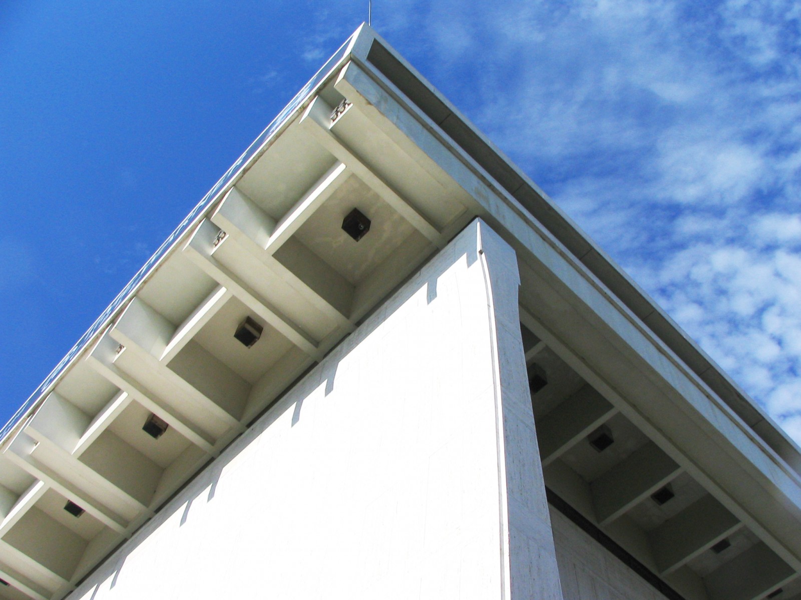WJE architects and engineers performed a thorough field survey of the library's existing travertine wall cladding, waterproofing system, and drainage system. To supplement and confirm the visual assessment, forty-two inspection openings were made at various locations, exposing key typical details. The investigation revealed cracked travertine pavers, severely deteriorated terrazzo, and below-grade water saturation—the result of a non-functioning drainage system. Based on the findings, the WJE design team recommended the complete replacement of the plaza paving, waterproofing, and drainage systems. Utilizing in-house testing capabilities, the team evaluated a selection of stone replacements based on various criteria: ability to support a vehicular loading of H15; resistance to weathering, slippage, and abrasion; and general durability. Complicating the selection process, the replacement material needed to be a similar thickness as the original stone—so as not to elevate the plaza higher than the building—and to possess similar aesthetic characteristics to maintain the design intent. The engineers and architects then designed an innovative replacement system consisting of new stone pavers on a latex-modified mortar bed, over a drainage mat, over a waterproofing system, over a sloped concrete topping slab. WJE oversaw the repair process and monitored movement at the building expansion joints to ensure minimal damage.