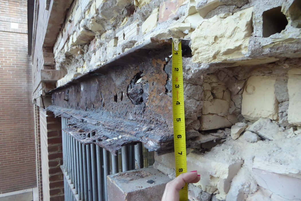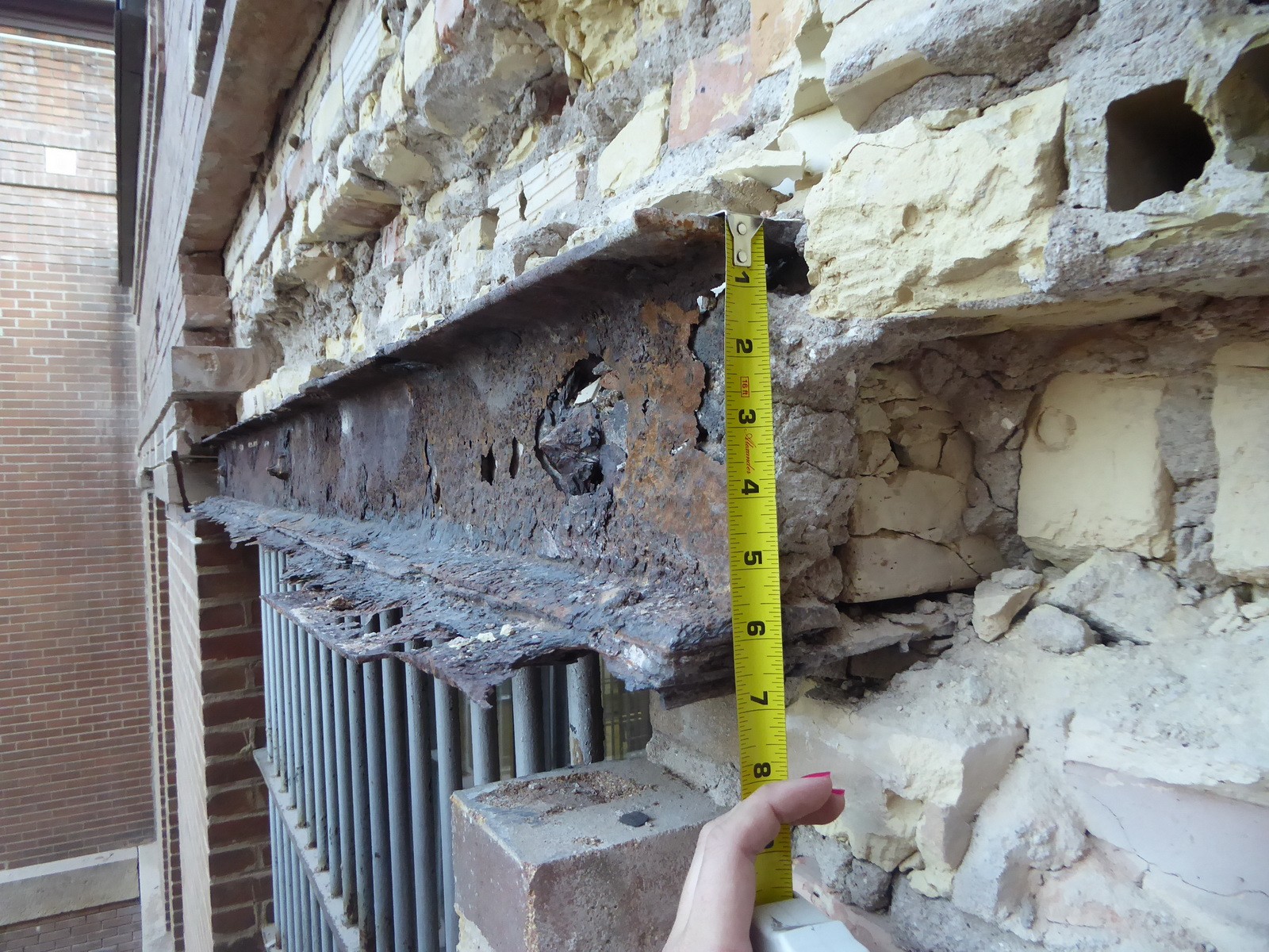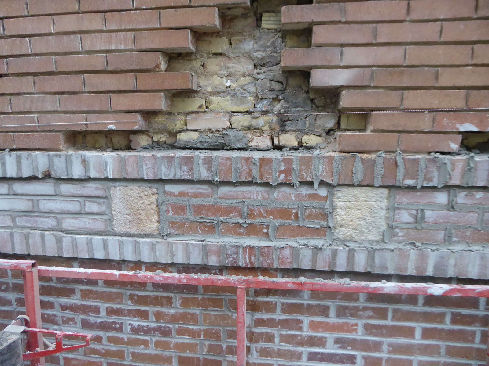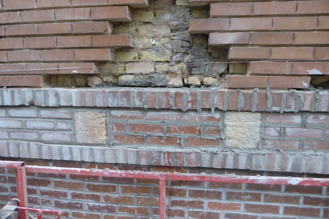 Following a competitive bid process, WJE provided construction period services. The team performed weekly site visits throughout construction to review concealed conditions and provide on-site documentation of the work in progress. Assumptions made by WJE during the design process regarding concealed conditions at embedded steel were found to be accurate, avoiding costly change orders in the work following exposure of these conditions and additional structural analysis by WJE engineers. The final scope of repairs included brick masonry repointing, brick and limestone replacement, steel lintel repairs and replacement, lintel flashing installation, sealant joint replacement, and limited masonry cleaning.