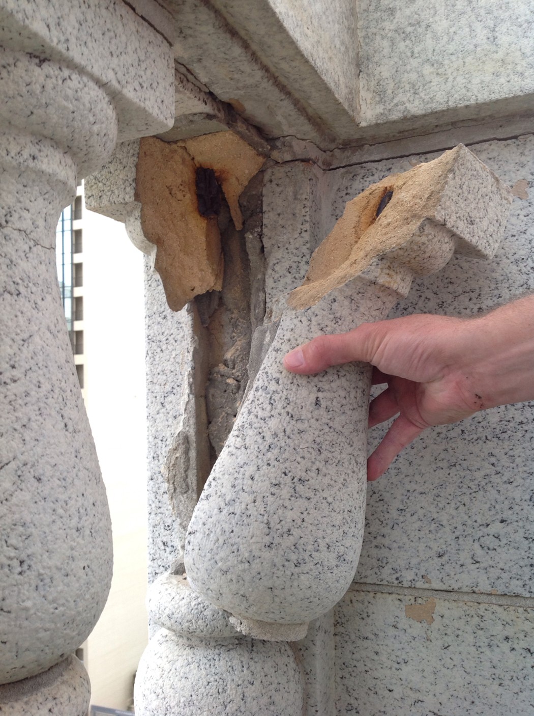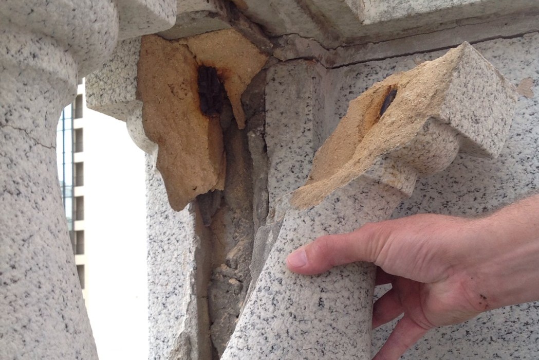 After a thorough investigation of the exterior terra cotta, windows, plaza, and roofing, including materials testing conducted in WJE's in-house laboratory, it was determined that a significant portion of the building facade and plaza was in disrepair. In total, nearly 7,000 terra cotta units were removed and replaced; another 2,000 terra cotta units were removed and reused; and 4,000 units were repaired in place. In combination with the terra cotta work, nearly 7,500 lineal feet of shelf angle repairs and new structural supports were added. To blend the new with the old, the entire terra cotta facade and plaza were restoration cleaned. The original windows had been previously replaced in the early 1990s and were known for water infiltration. WJE developed a historically sensitive repair solution of sealant to maintain the appearance of the existing windows while improving the window performance. The slate and granite plaza that encompasses the city block around the building was also in disrepair. Plaza repairs included concrete structural repairs, repointing, isolated slate and granite replacement, and restoration of the eight bronze, historic lamp posts. All of the roof levels on the building also were removed and replaced, and a new building lighting system was installed.