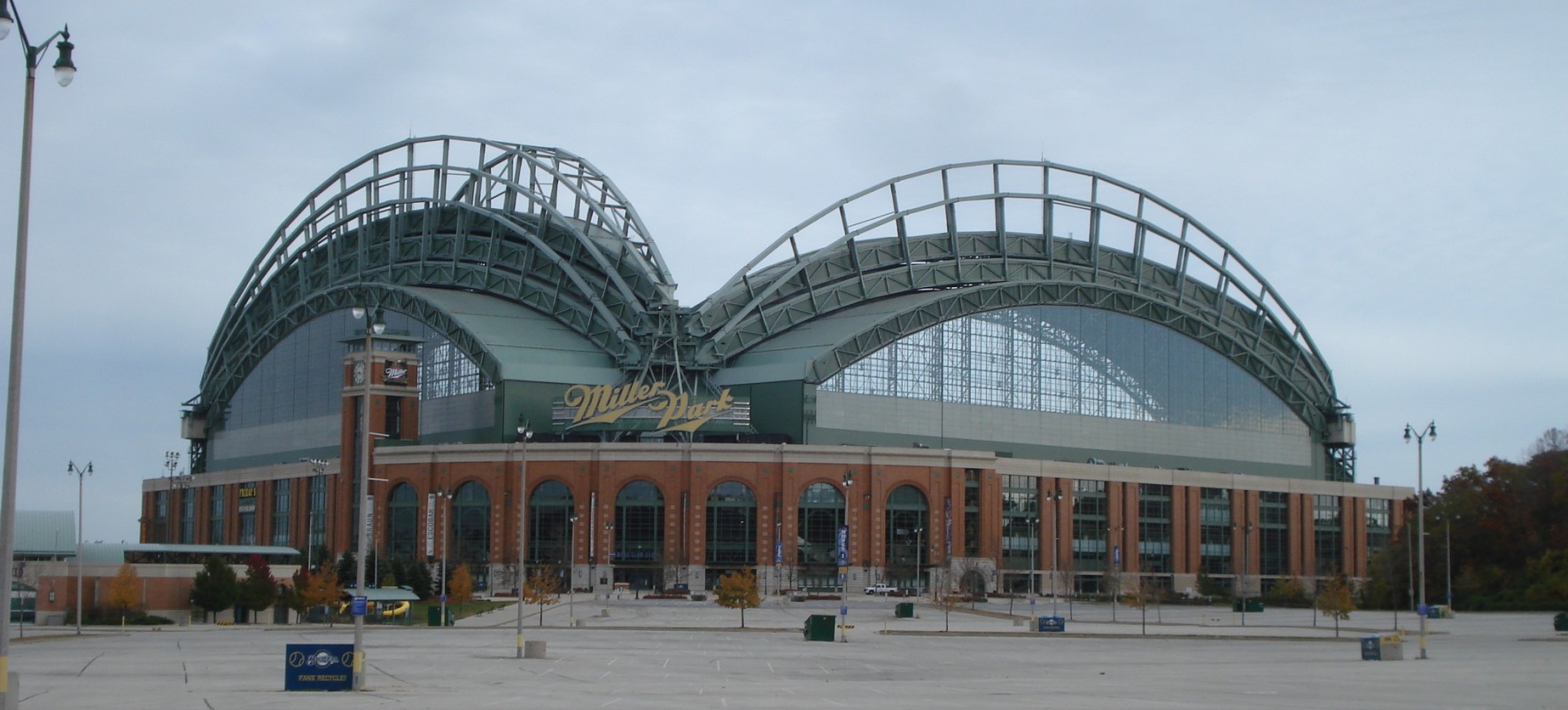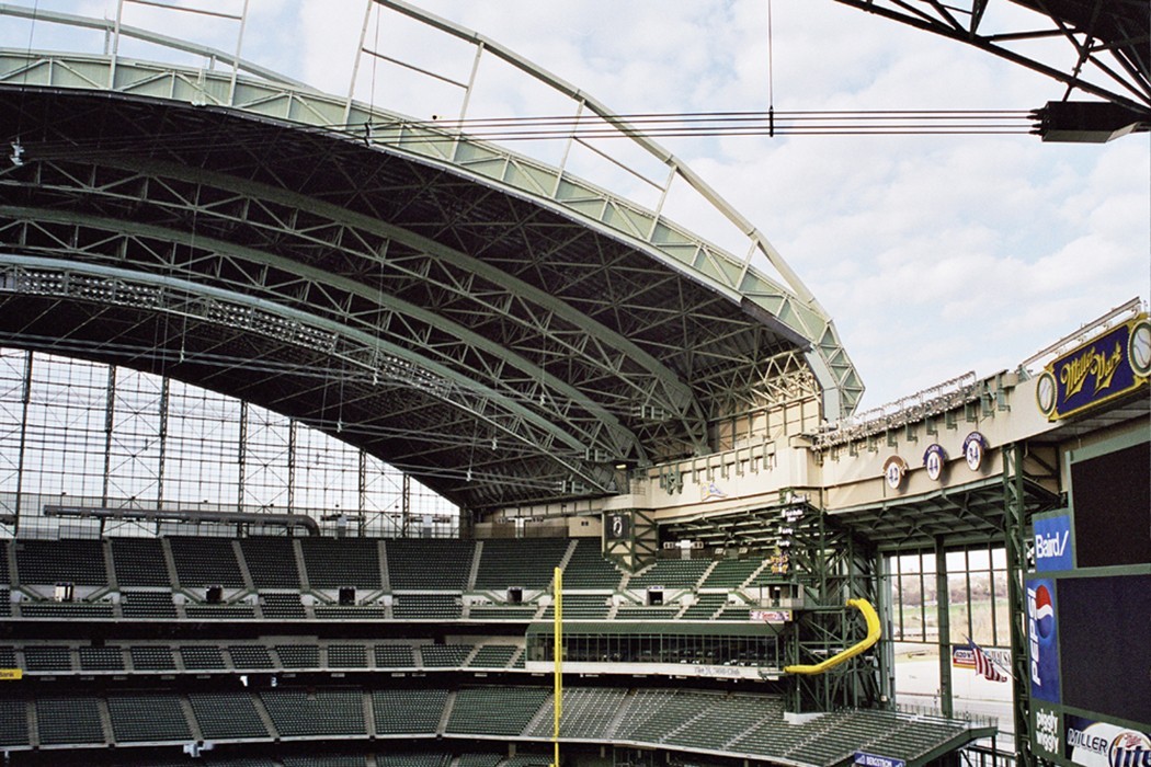 The most distinguishing feature of Miller Park is its retractable roof. The 12,000-ton, seven-panel roof can be opened or closed in ten minutes, guaranteeing perfect game conditions at all times. The five panels, three along the third base line and two along the first base line, fan out from a pivot location behind home plate. The panels are powered by a 60hp engine, or "bogie," that moves along a semicircular rail about 150 feet above the exterior outfield wall. The Milwaukee Brewers have called Miller Park home since the 2001 season.