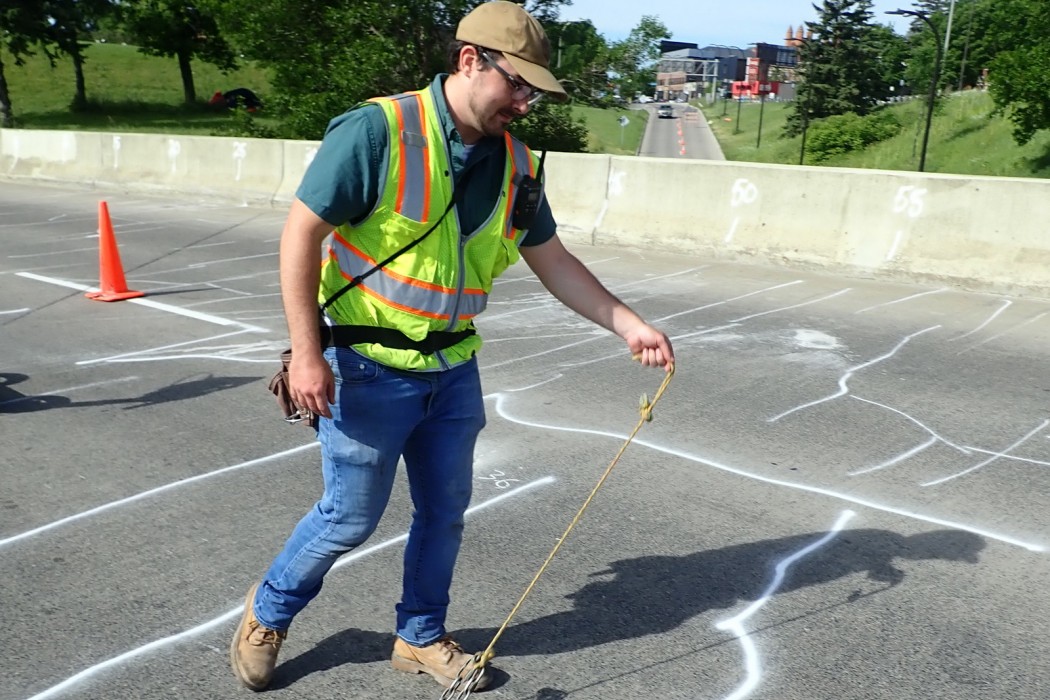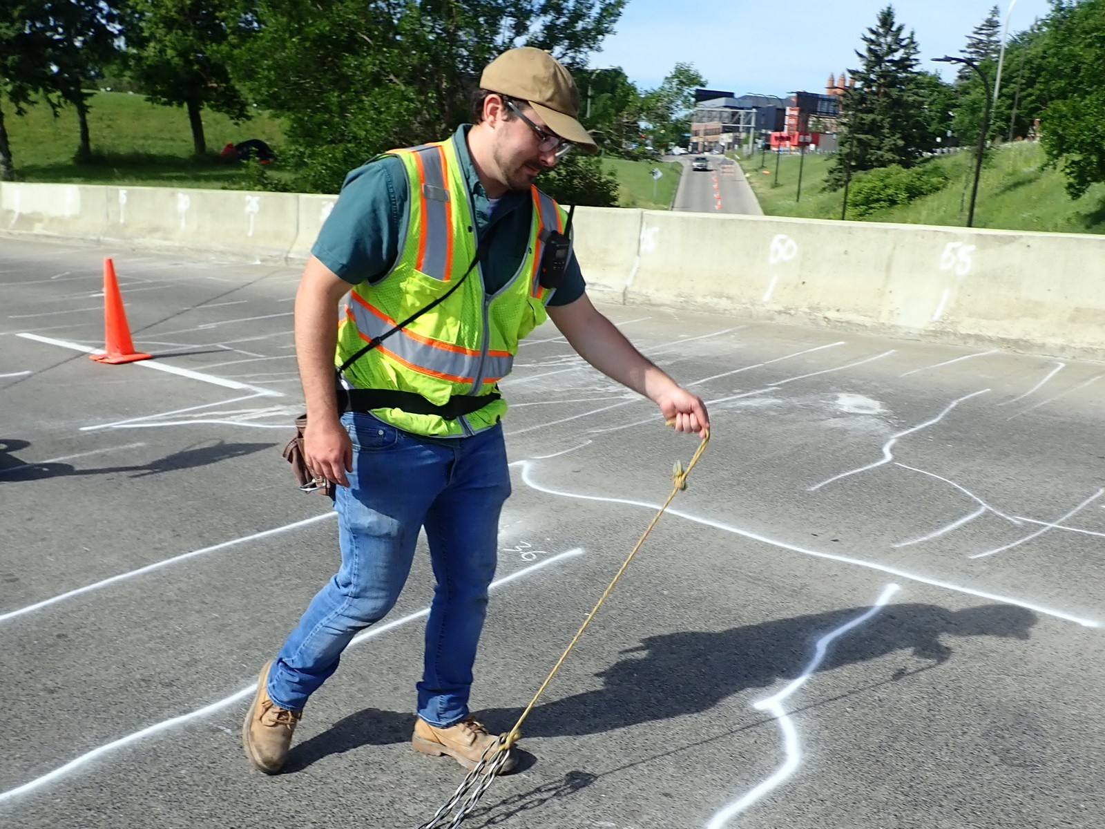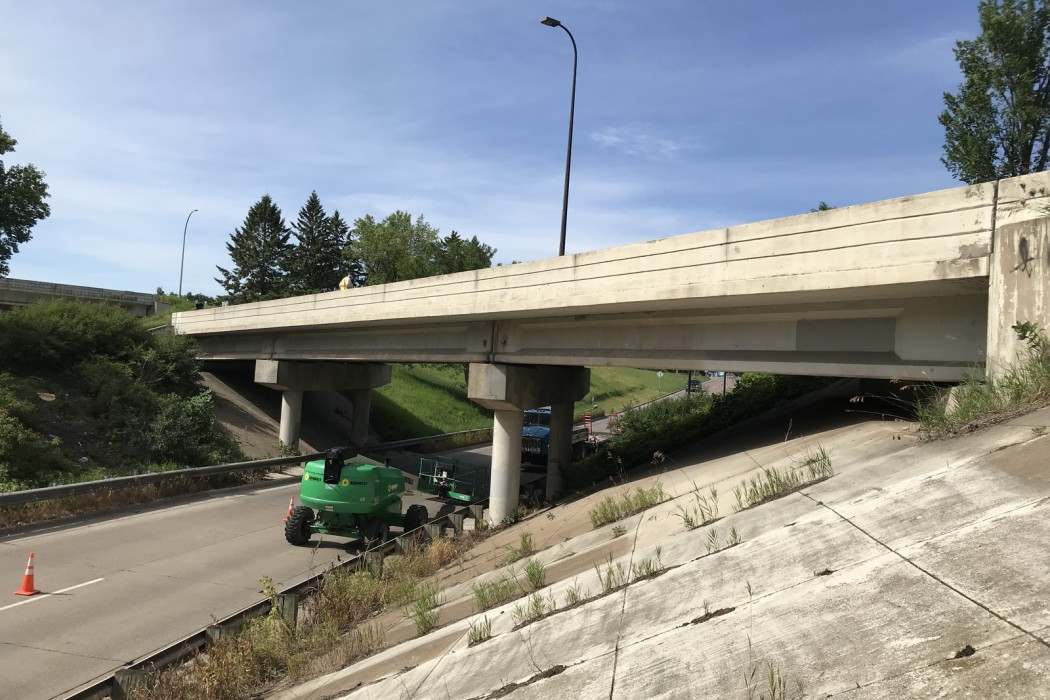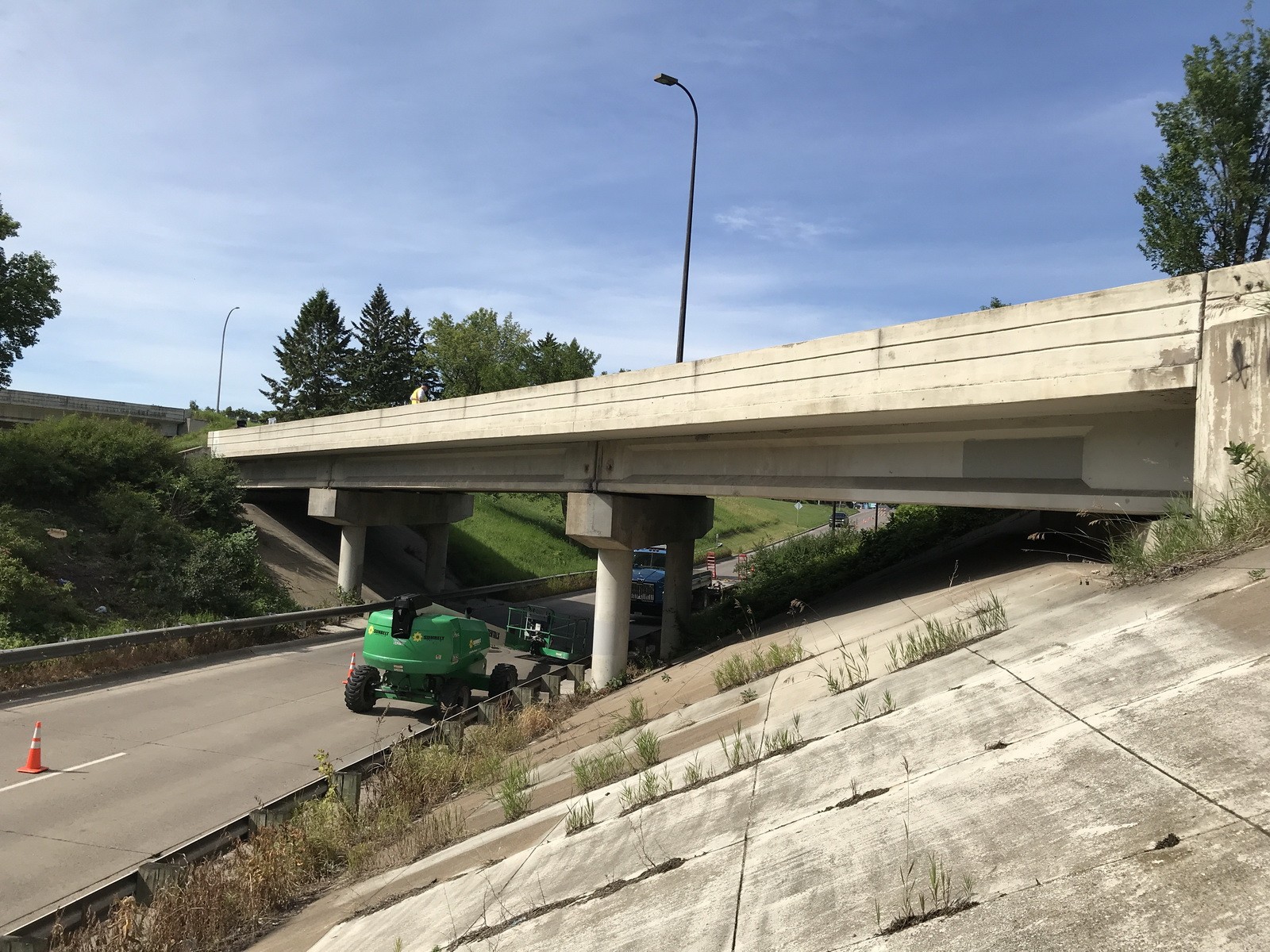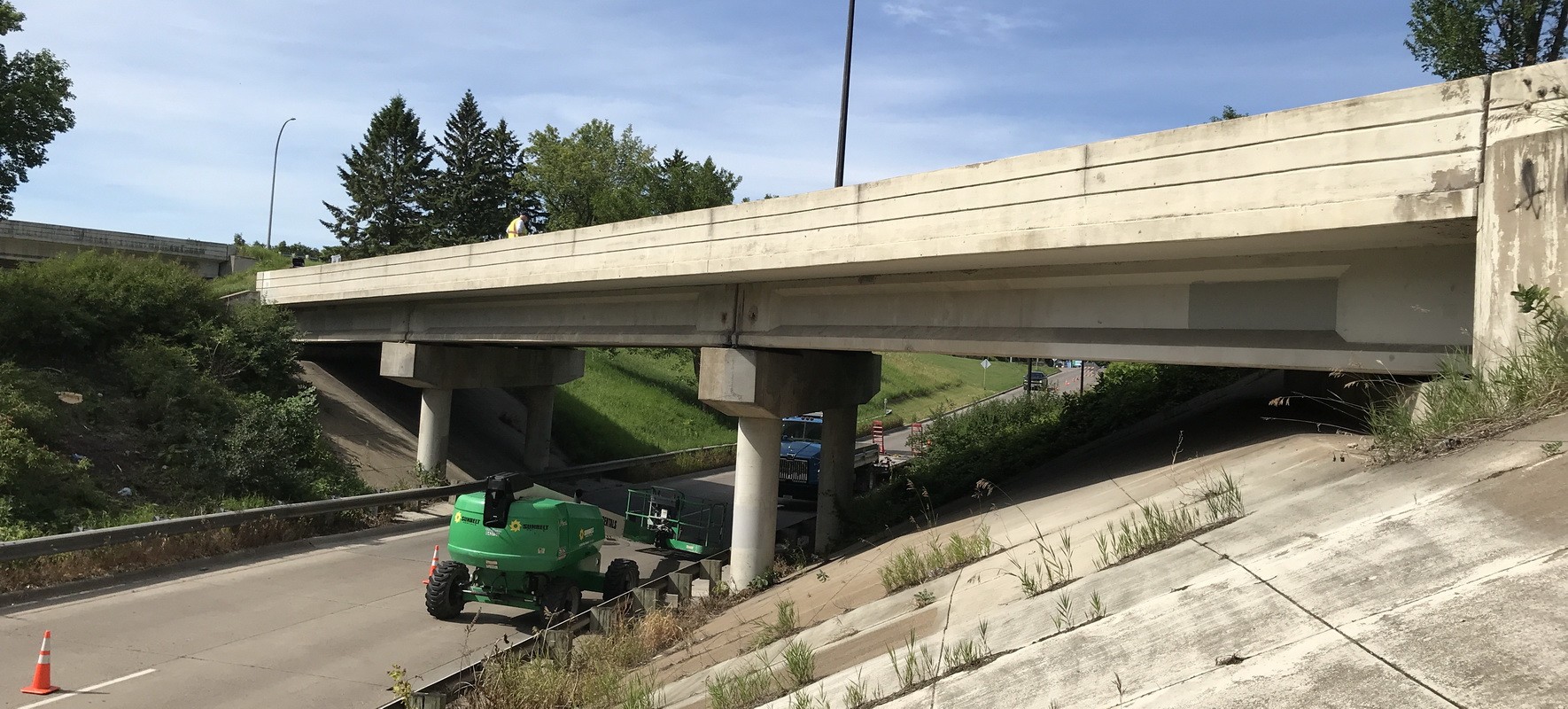 Minnesota Bridge No. 27099 carries Lyndale Avenue South over Hennepin Avenue in a downtown area of Minneapolis. The bridge was originally constructed in 1965 and has a total length of approximately 130 feet. There are three spans between the concrete abutments at each end of the bridge and two interior concrete bridge piers. Three precast, prestressed concrete I-girders support each span. The bridge was modified in 1989, including removal and replacement of the deck and edge railings, repairs to the abutments, and installation of a light pole attached to the west railing. Annual inspections by the City identified concrete distress that prompted WJE’s review.