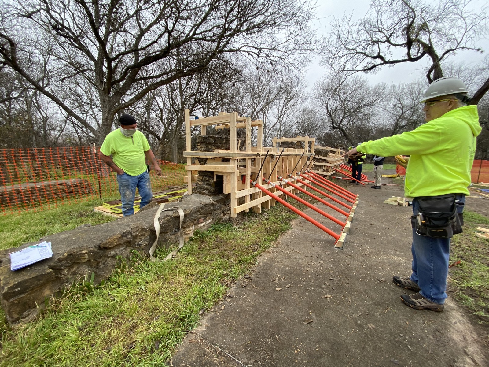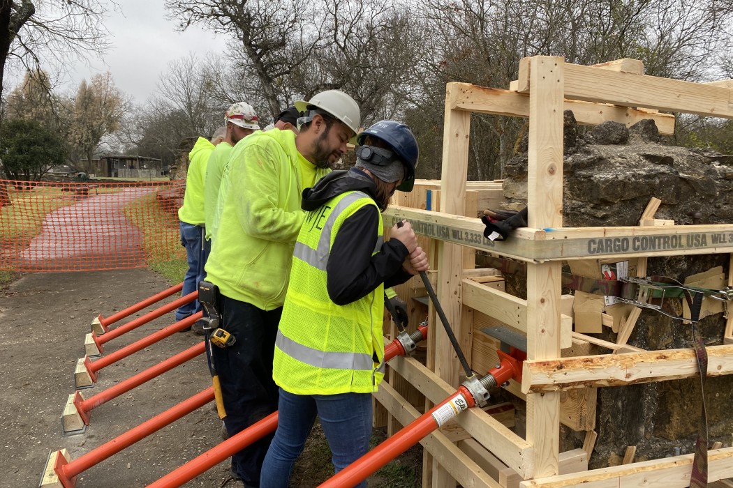 WJE was engaged by the repair contractor to provide engineering design, construction documents, and construction support services for the rotation and straightening of two sections of masonry wall comprising Mission Espada’s North Gate wall feature. As this is a National Historic Site, any modifications to its structures must comply with the Secretary of the Interior’s Standards for the Treatment of Historic Projects and be reviewed and approved by the Texas Historical Commission. Continuous archeological monitoring was required during ground disturbance activities.