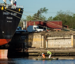 The lower ten feet of the gate were replaced in 2005, and a new coating system for structural steel components was installed. Repairs in 2016 and 2019 replaced bearings, races, and seals at the cable pulleys at the top of the gate and addressed damaged sheaves. Galveston County was awarded funding from the U.S. Army Corps of Engineers (USACE) to help ensure the continued functionality of the Texas City Hurricane Levee. The County used part of this funding to address the Tide Gate’s failing coating and corrosion at the lower portion of the gate.