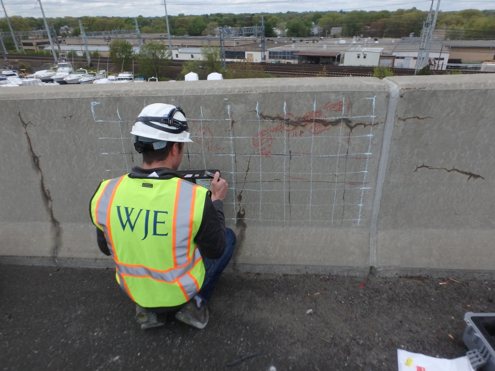 To complete our investigation, WJE performed visual surveys, nondestructive testing, and laboratory studies—including compression strength testing and petrographic examinations—to characterize the concrete, discover the cause(s) of the cracking and staining, and determine if defective materials existed in the concrete.