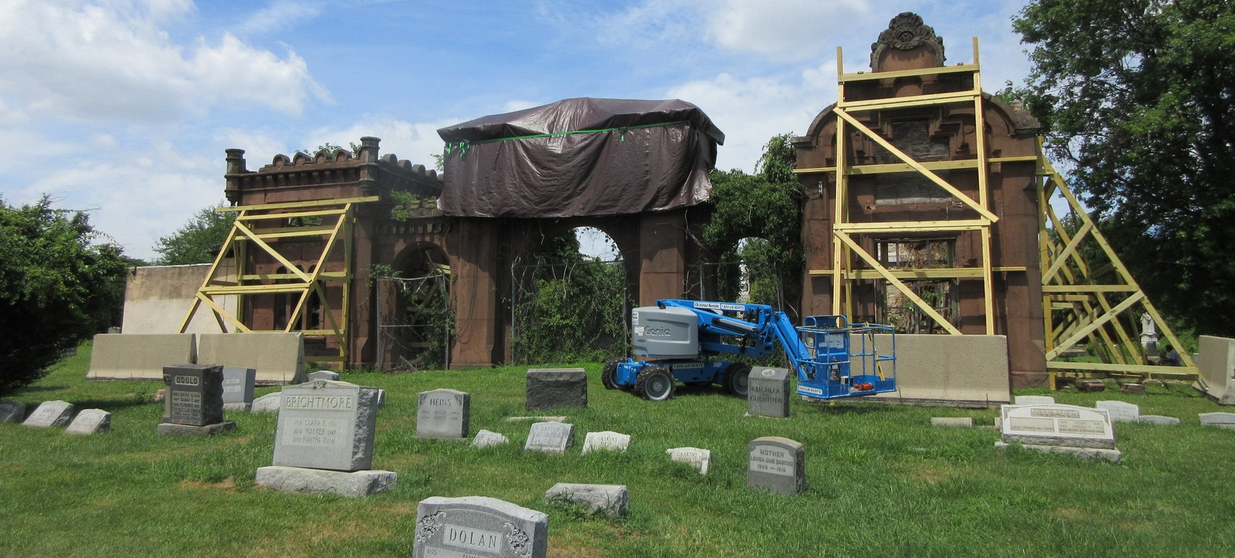During the late twentieth century, ownership of the cemetery became unresolved and maintenance of its historic structures was neglected. The Preservation Alliance of Greater Philadelphia named the gatehouse one of its “Places to Save” in 2014 and facilitated efforts to designate the cemetery and gatehouse as eligible for the National Register of Historic Places.
