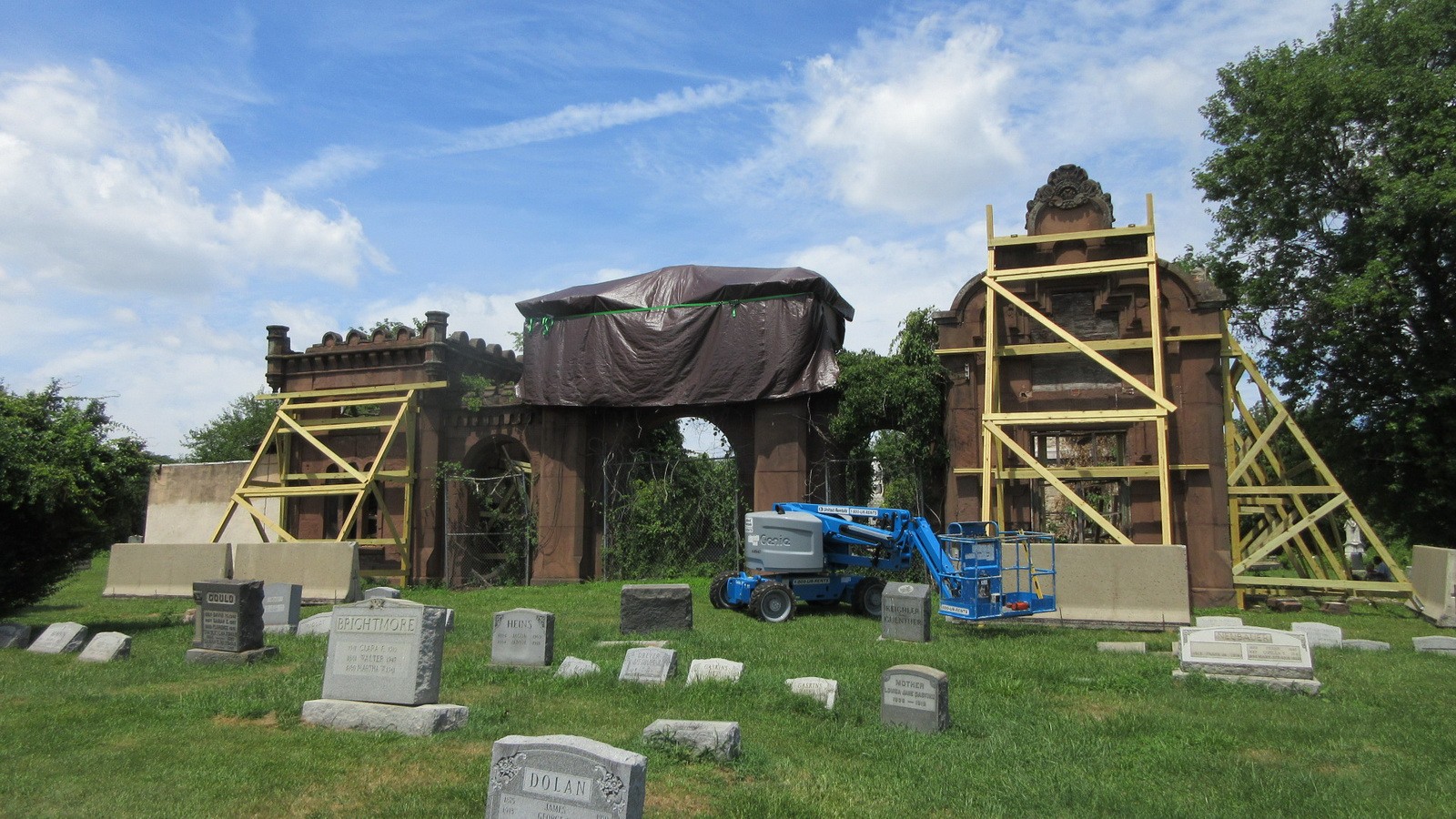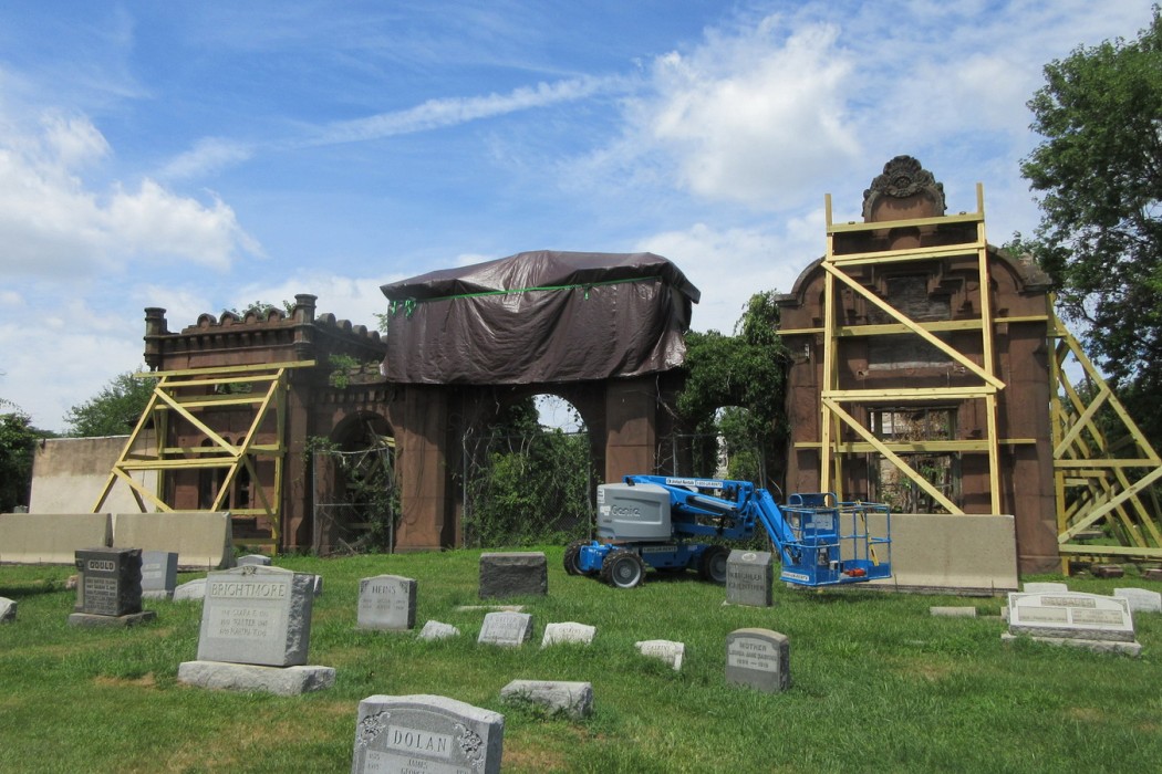 Deteriorated by weather exposure and damaged by vandals, the gatehouse was at risk of collapsing before it could be restored by the Mount Moriah Cemetery Preservation Corporation, the nonprofit entity that took over management of the cemetery in 2014. WJE provided pro bono structural engineering services to design temporary stabilization measures that will limit further loss of historic fabric until funds can be raised for a more extensive restoration.