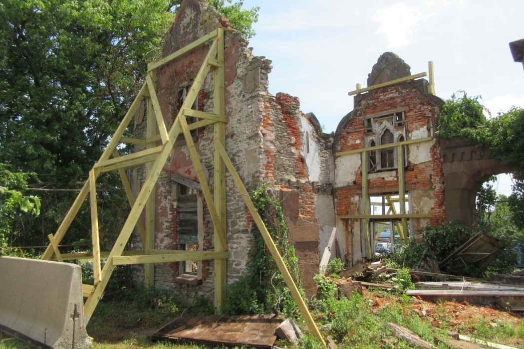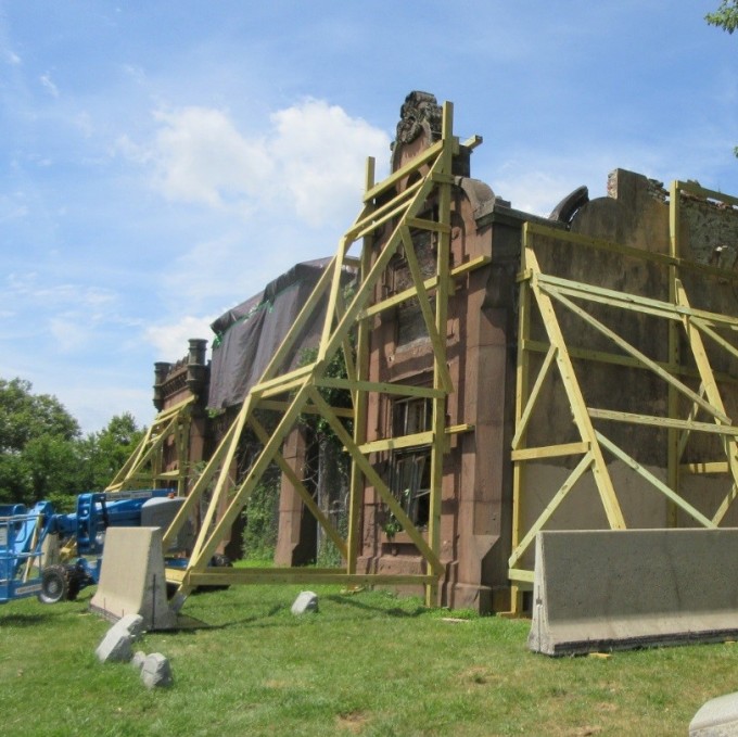 WJE communicated with Philadelphia’s building department, which had issued a violation because of the structure’s deteriorated condition, to mitigate the possibility of a demolition order. WJE designed temporary stabilization measures utilizing readily available lumber sizes and connectors, which were assembled by a local contractor at cost. Because of the proximity of grave sites to the perimeter of the structure, precast concrete traffic barriers were used as reaction blocks in lieu of foundations below grade. This not only minimized ground disturbance and eliminated the need for archaeological exploration but also reduced cost and resulted in a fully reversible intervention. The completed stabilization measures attracted press coverage that should help the Mount Moriah Cemetery Preservation Corporation raise funds for a more extensive restoration of this landmark structure that anchors one corner of the historic cemetery site.