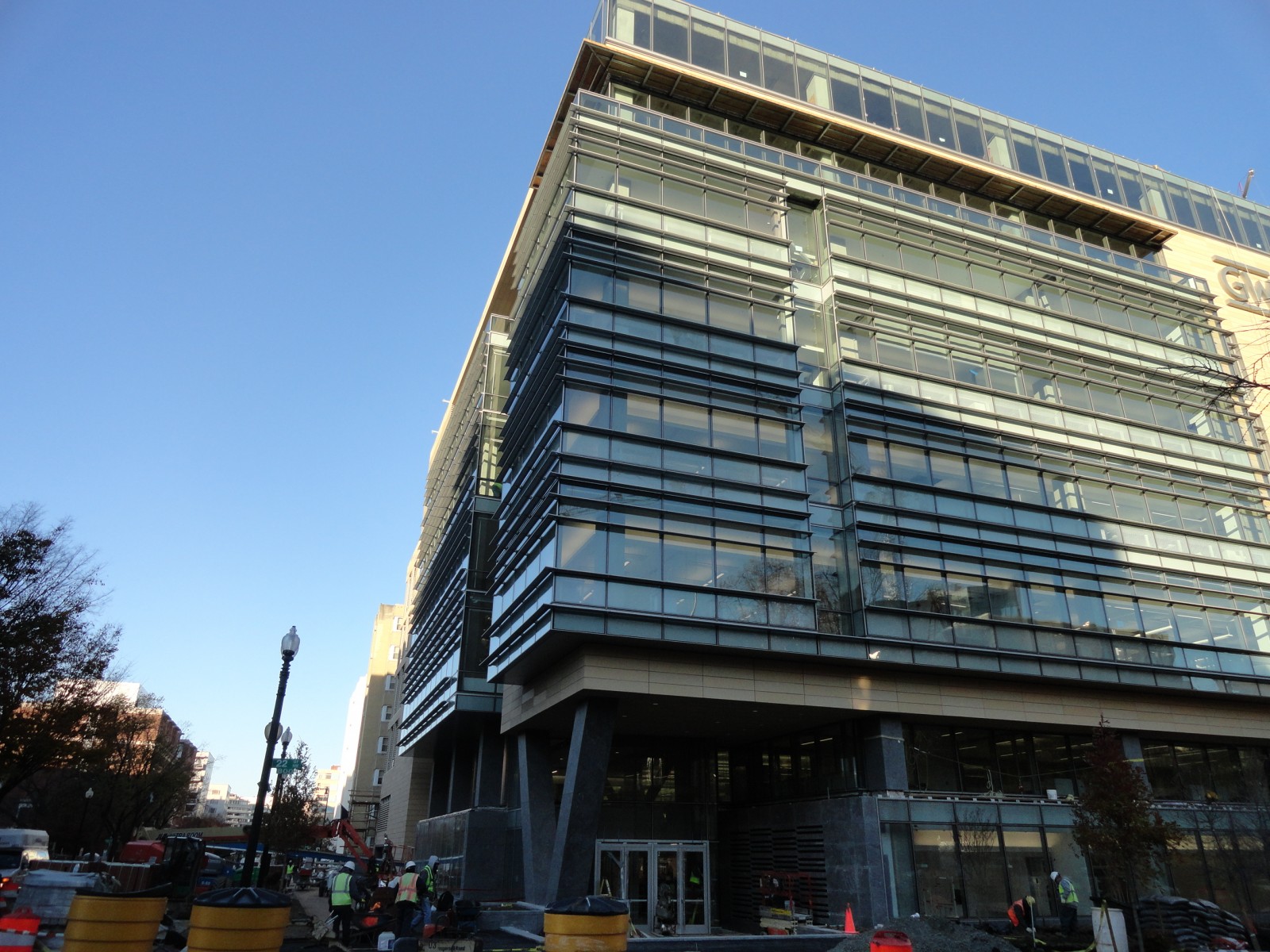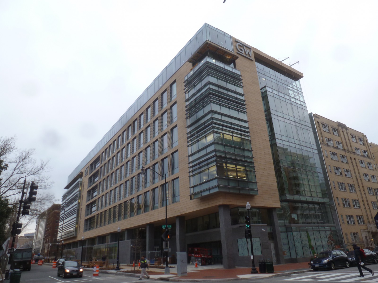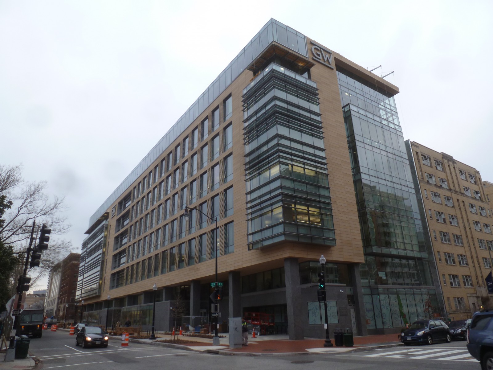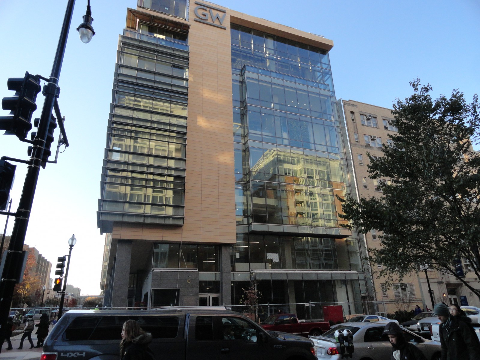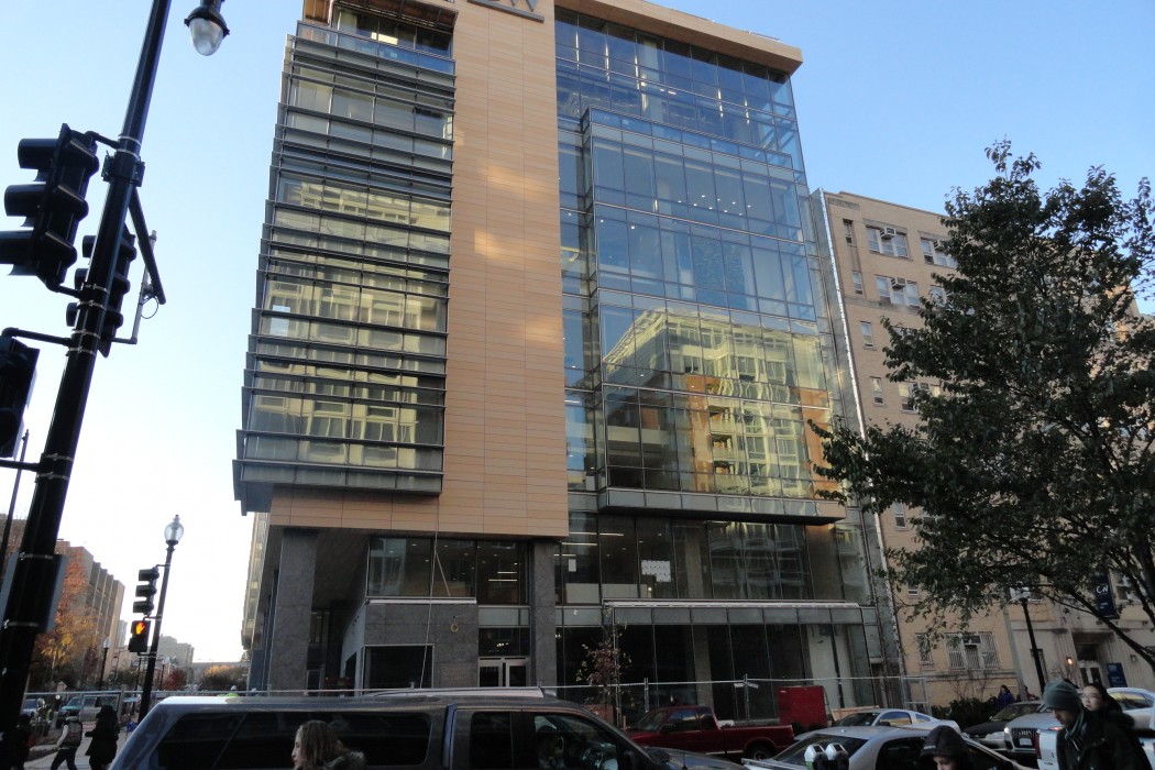 The new Science and Engineering Hall (SEH) includes a mixture of terra cotta rain screen panels, unitized curtain wall with engineered transition assembly, and metal panel cladding with modified bitumen green roofs as well as polyvinyl chloride roofs, a pyramidal skylight, a functioning greenhouse, and interior planters containing fully grown trees. The building abuts two existing student residence halls on the campus as well as the Foggy Bottom-GWU Metrorail Station.
