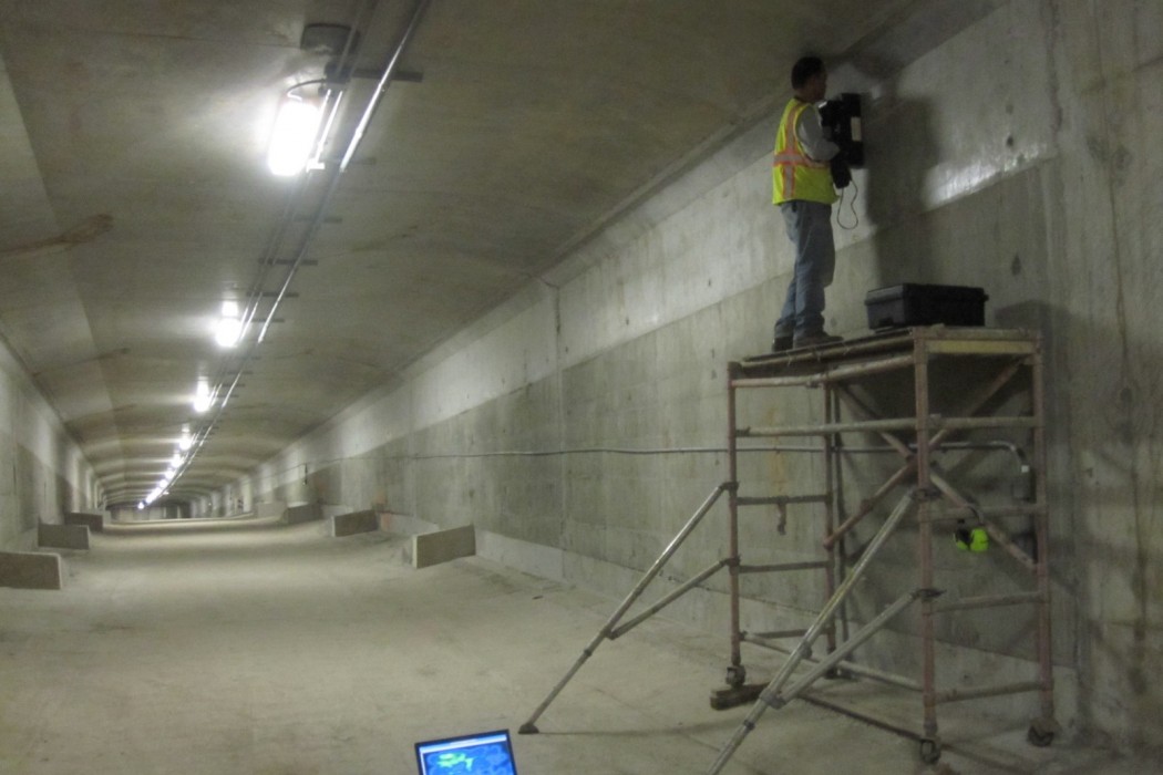 In preparation for a full-scale inspection of the bridges, WJE engineers completed a thorough document review, surveyed the bridges with ground penetrating radar to identify tendon ducts susceptible to voiding, and engaged in field reconnaissance to determine their accessibility. From the data collected, WJE technicians replicated voids found in the bridges using specially constructed laboratory test blocks to validate the effectiveness of the MIRA tomography equipment—a nondestructive method of detecting voids—prior to its full-scale implementation.