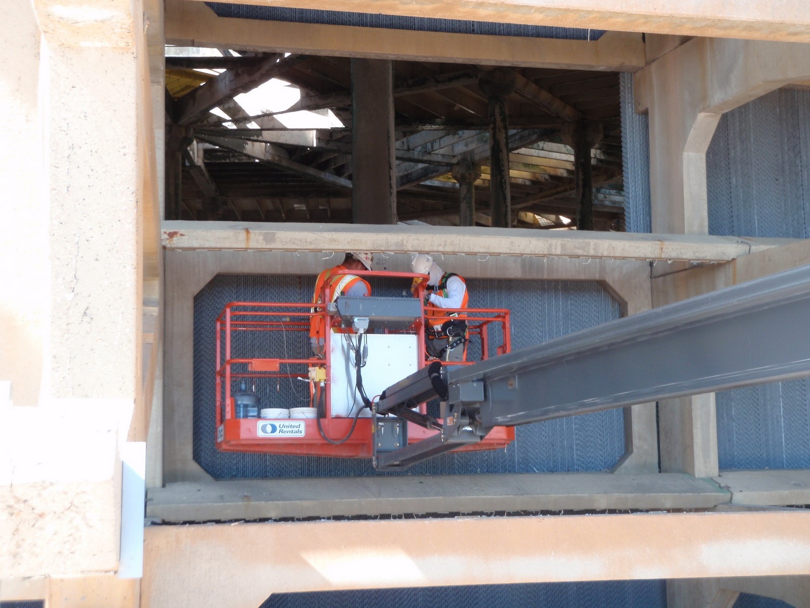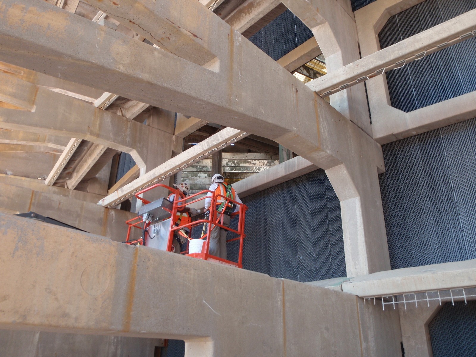 The mechanical draft cooling towers at Palo Verde Nuclear Generating Station have been in service for approximately twenty years, with a desired service life of an additional ten to fifteen years. To ensure the safe operation of these structures for the intended remaining service life, Arizona Public Service (APS) retained WJE to perform condition assessments of the structures twice a year over a multiyear period during scheduled outages and to identify characteristic distresses and provide repair recommendations.