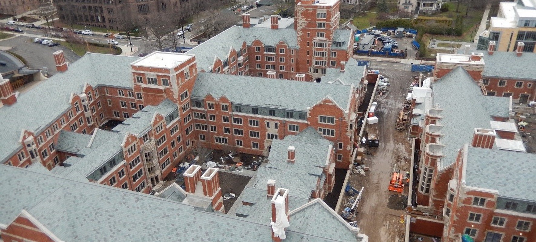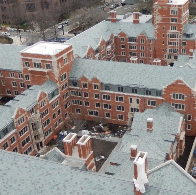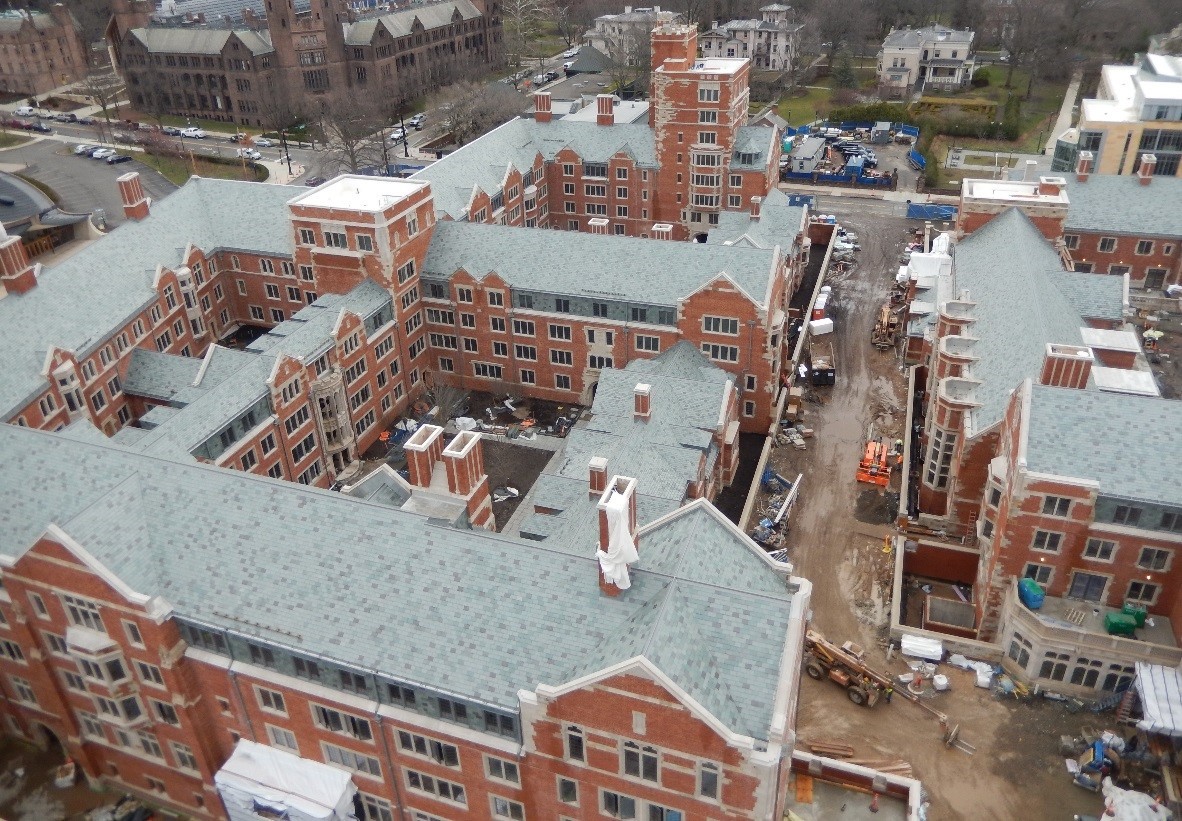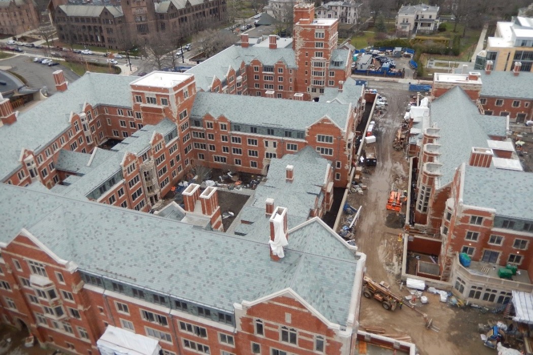 Prior to issuance of the construction documents, WJE performed a third-party review of building envelope components and waterproofing systems, including below-grade waterproofing; plaza/terrace waterproofing; under-slab vapor barriers; membrane, flat seam metal, and slate roofing; brick and stone masonry; cast stone; cavity wall air/vapor barriers; cavity wall flashing; roof drainage systems; and steel windows.