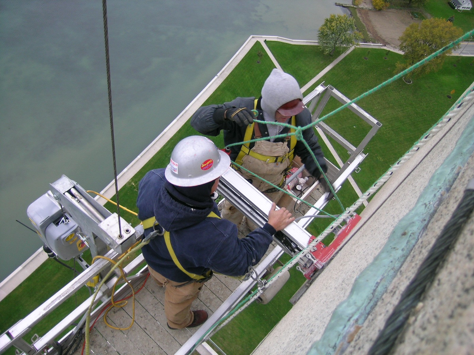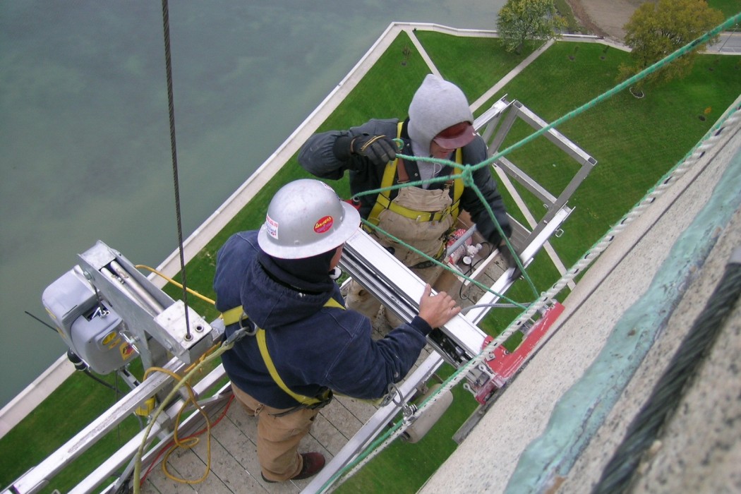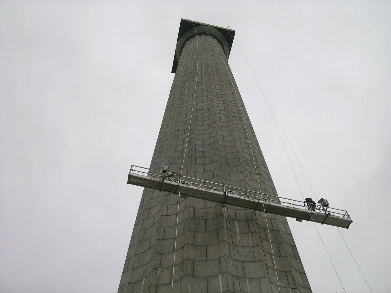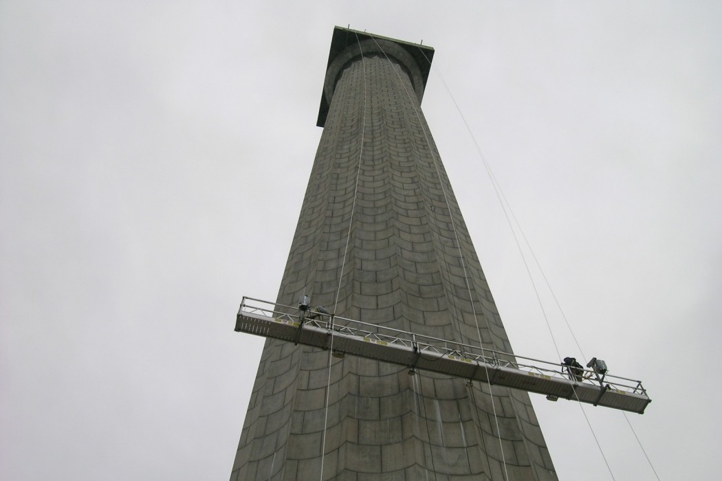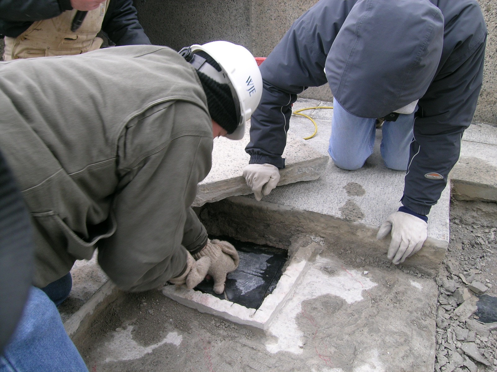 After reviewing documentation of the memorial's original construction and analyzing its previous repairs, the experts at WJE used special access techniques, including rappelling and swing stages, to conduct a close-up visual inspection of the entire memorial and collect concrete and granite samples for testing in WJE's laboratories.