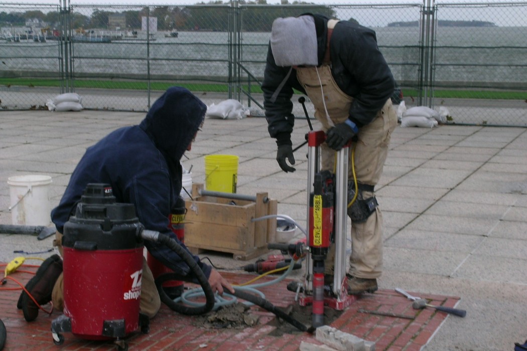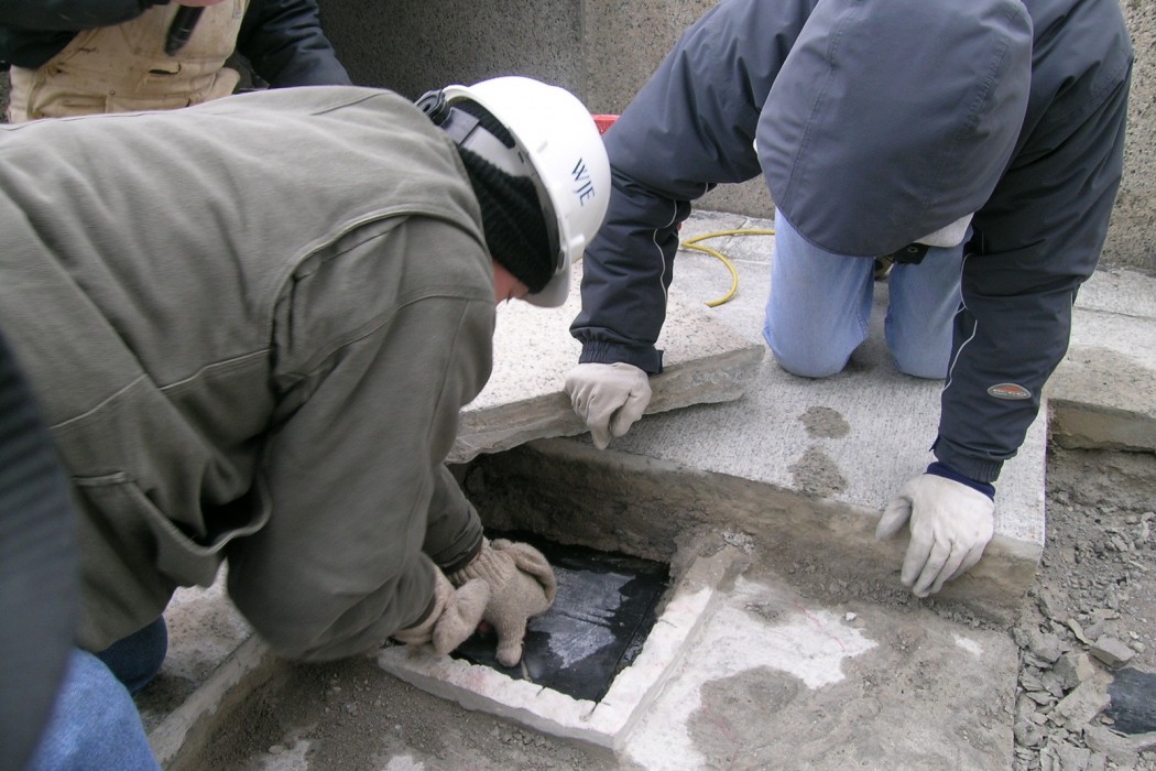 From the investigation, WJE determined that ineffective waterproofing systems allowed moisture to penetrate the concrete, resulting in freeze thaw deterioration of both the memorial and the plaza. This deterioration, coupled with through-structure anchors that had been installed as part of earlier repairs, led to cracking. Of particular concern were six fascia panels that exhibited cracking similar to the one from which a portion fell, presenting an imminent hazard.