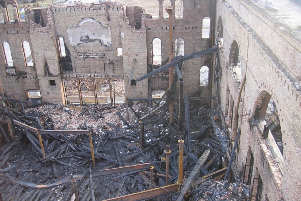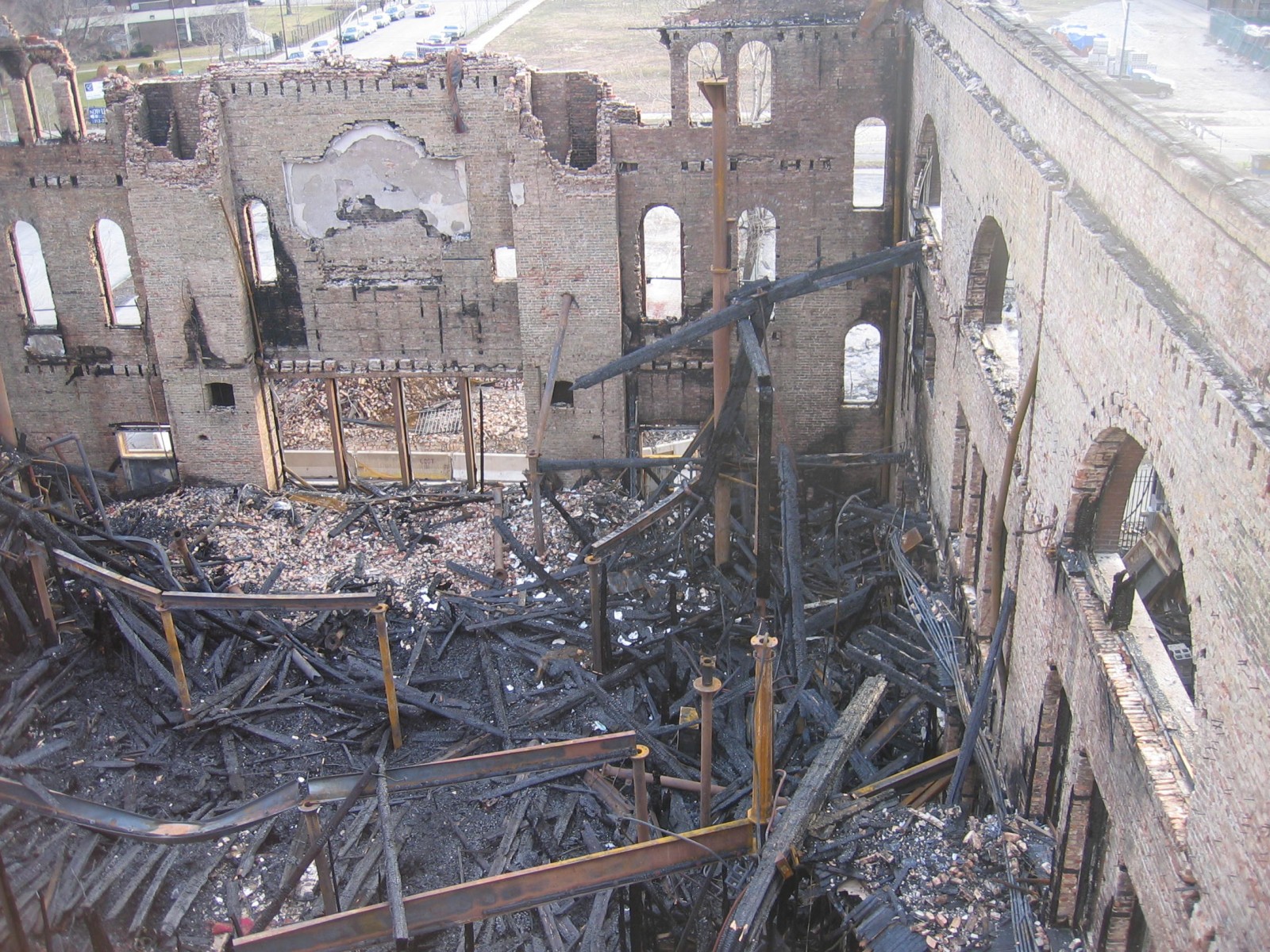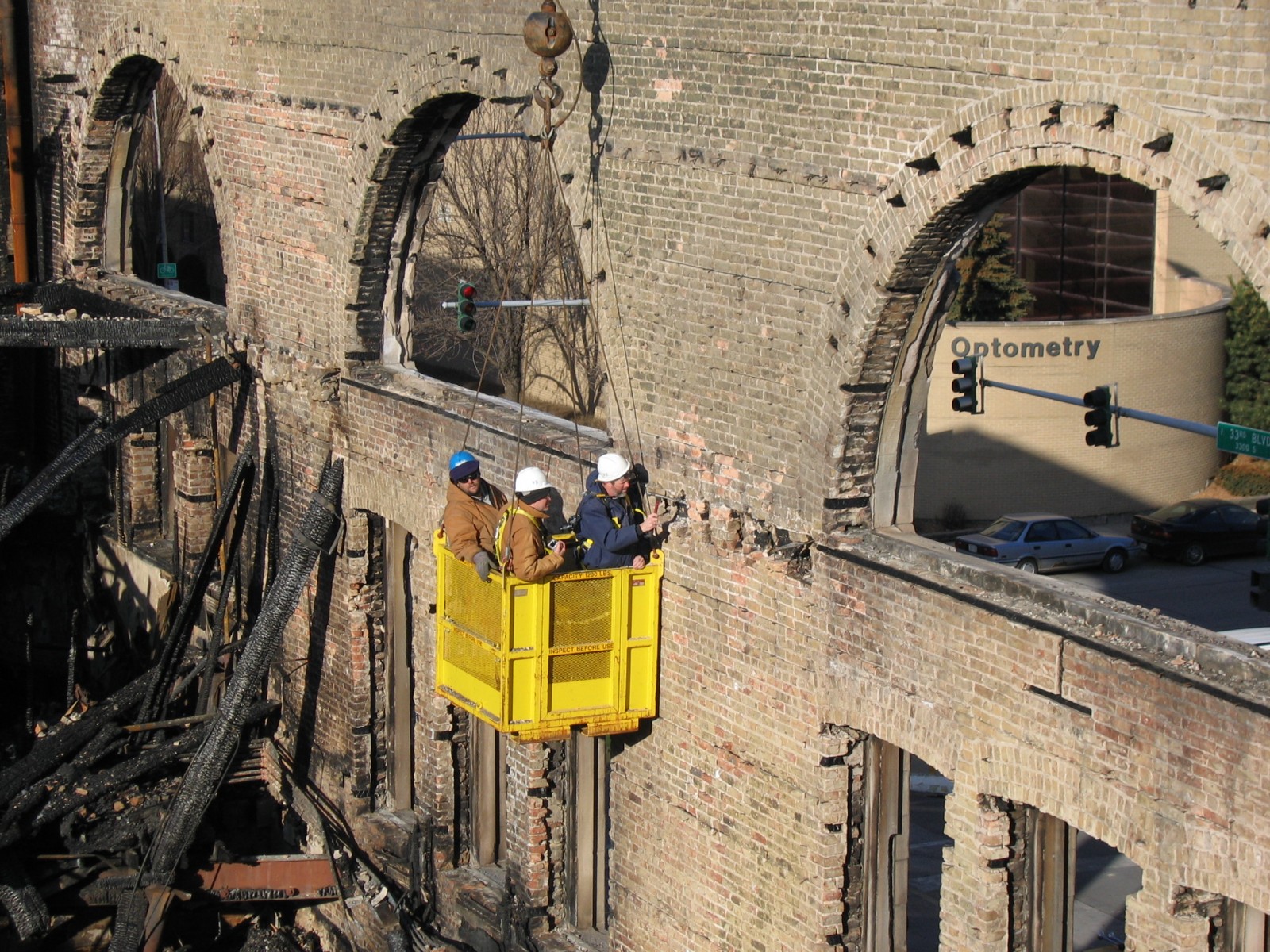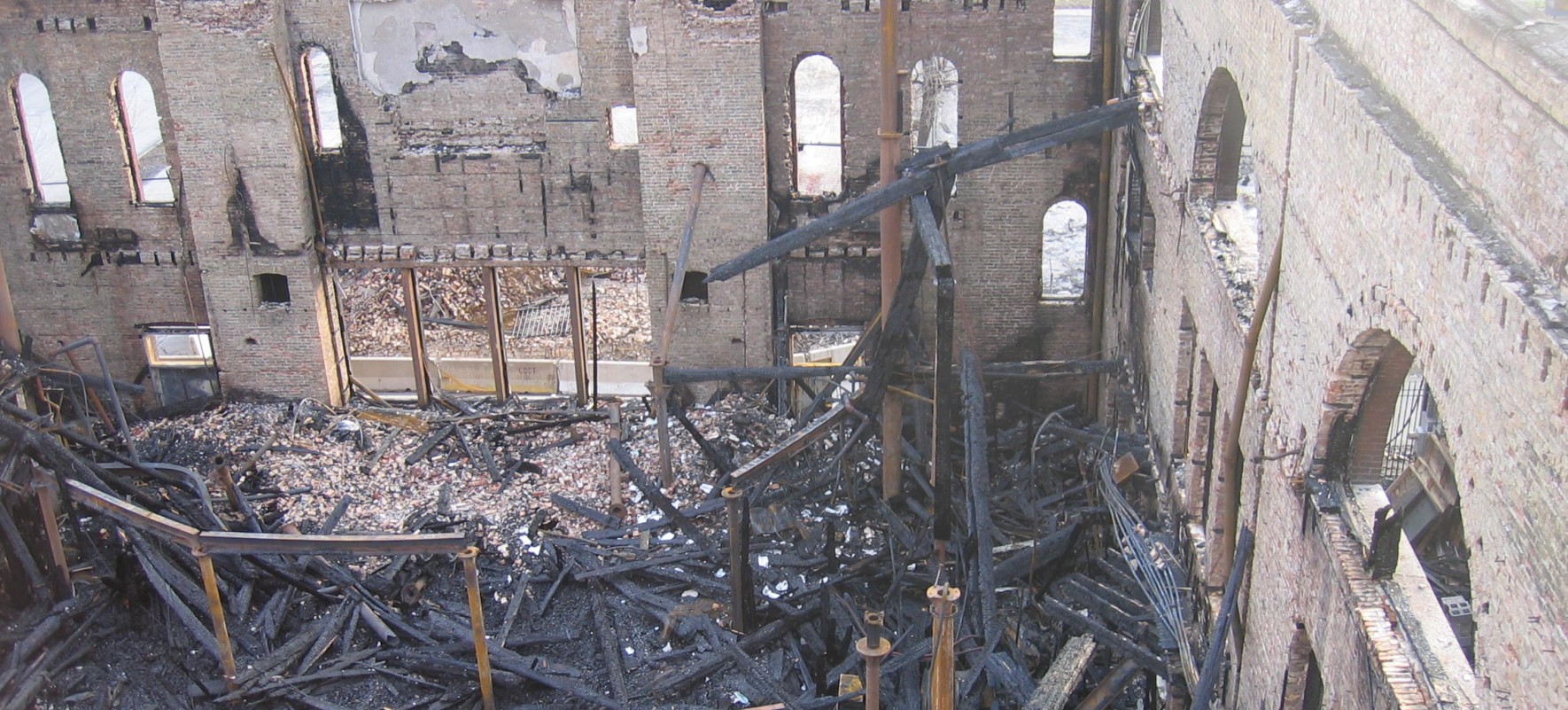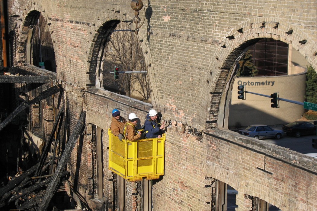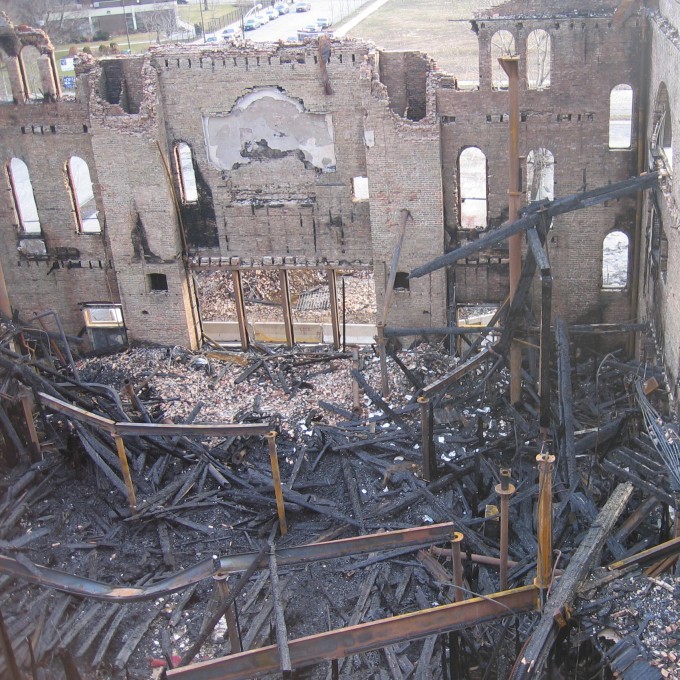 The building suffered extensive damage during a major fire that occurred in January 2006. Almost the entire interior of the structure above ground level was destroyed by the fire and ensuing collapse. The destruction of the interior structure of the church building left the remaining exterior historically significant masonry walls in an unsupported condition when exposed to wind loads. The City of Chicago retained WJE to assess the damage and to develop a program to provide for public safety.