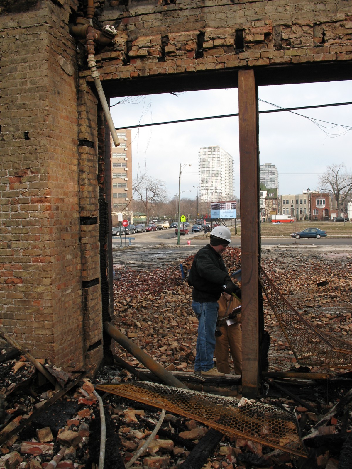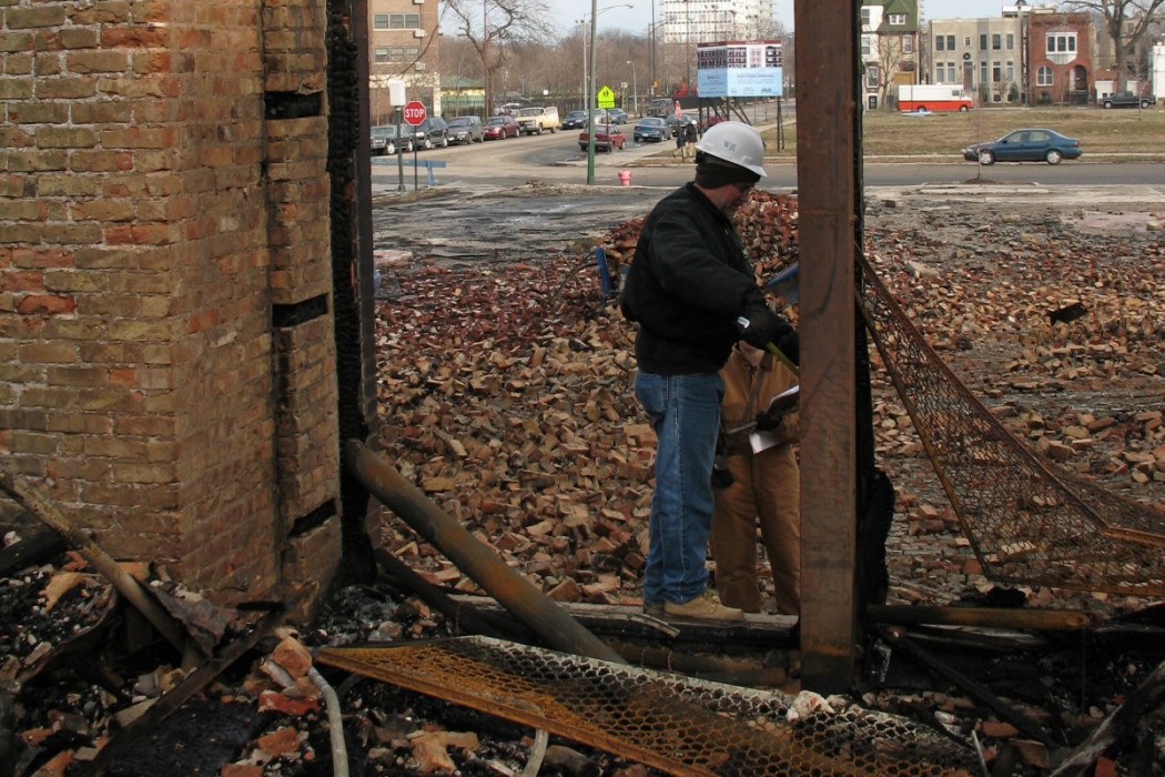 For the City of Chicago, WJE performed a limited structural analysis, finding that while the exterior walls were stable under their own self-weight, the walls in their post-fire condition were unable to resist the wind loads specified by the Chicago Building Code. WJE developed a safety zone concept that provided for public safety while also allowing for partial reopening of an adjacent, major thoroughfare to vehicular traffic.