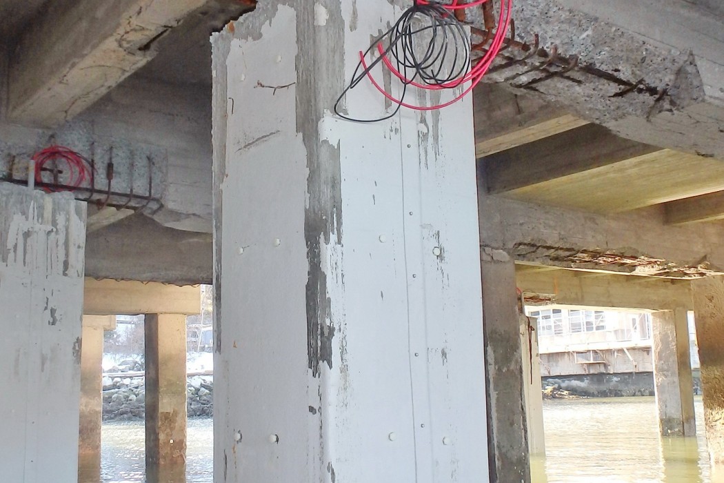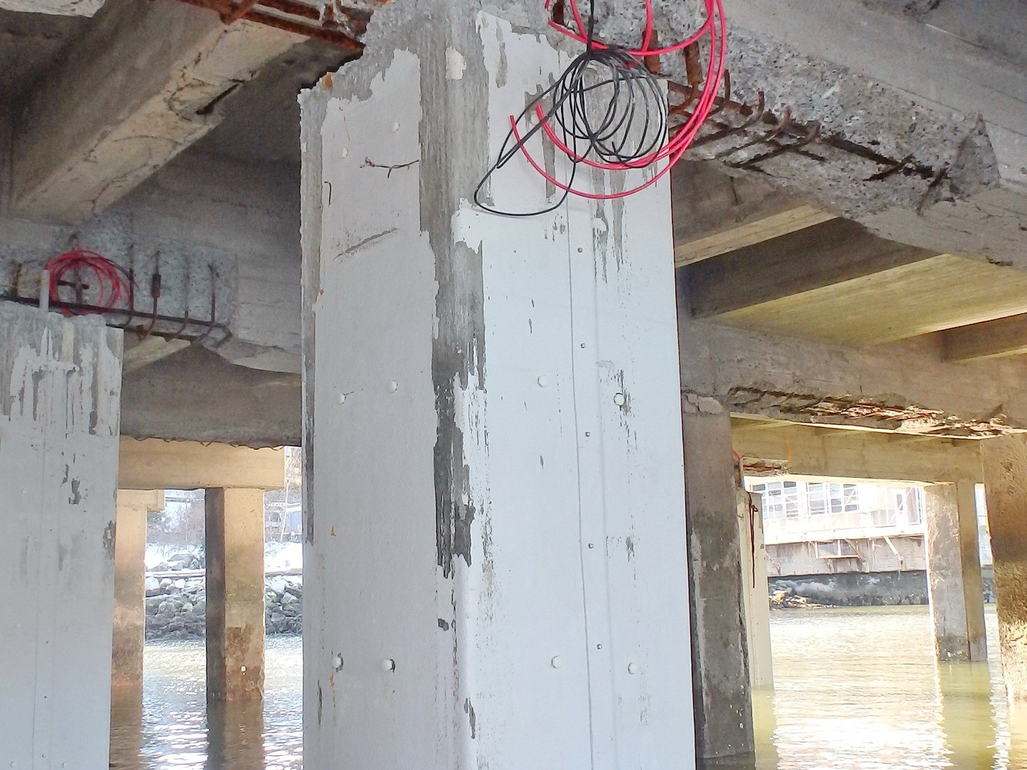 WJE developed repair documents following an extensive condition survey consisting of inspection, nondestructive testing, and laboratory testing. The phase I repairs consisted of installing cathodic protection “life jackets” to deteriorated piles. The Phase II repairs included jacketing additional piles, as well as repairing 400 feet of concrete girders and 300 feet of concrete beams.