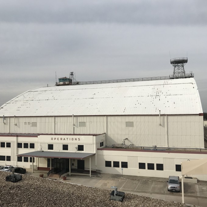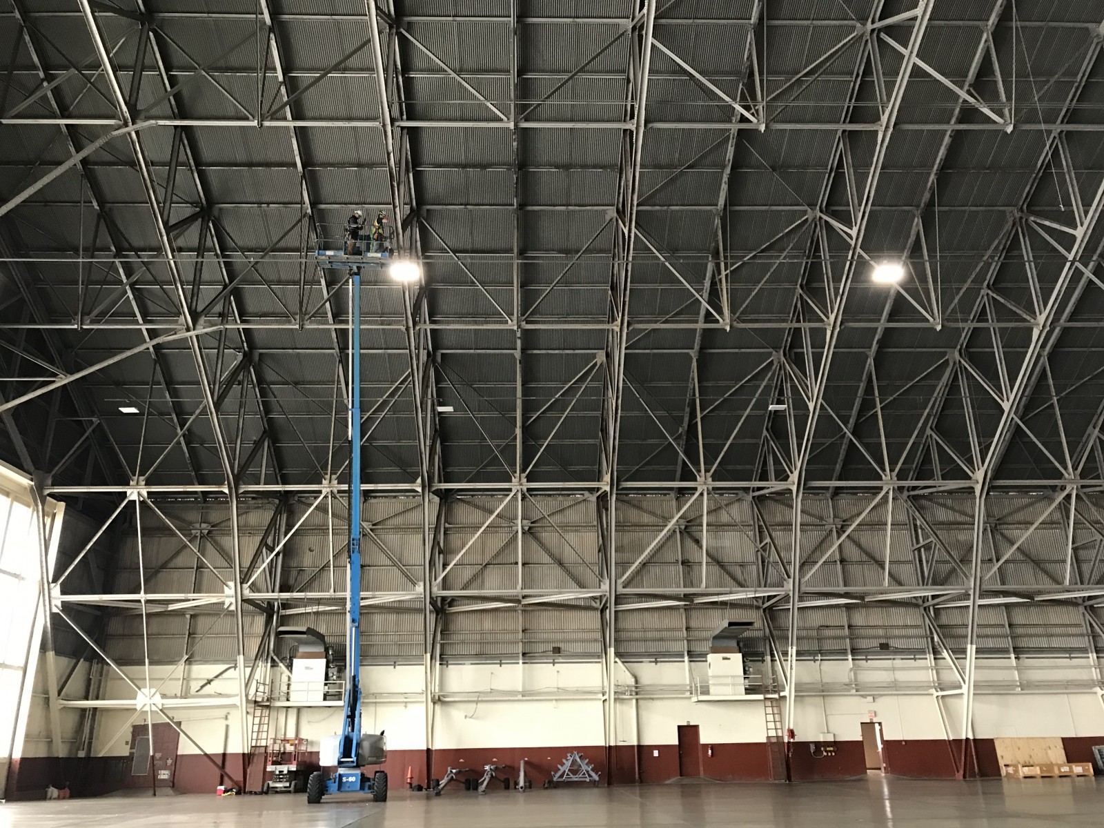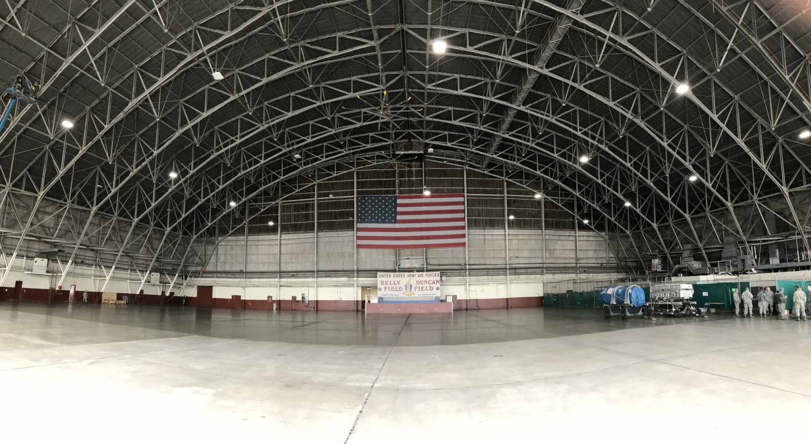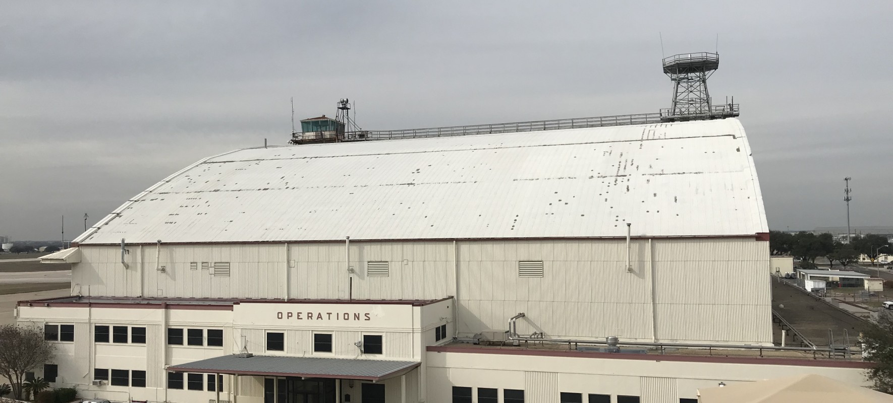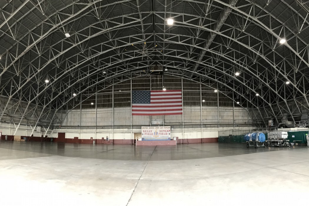 Port San Antonio’s Building 1610 hangar was built in 1940 and is supported by three-hinged steel truss arches spanning 275 feet. The truss elements are hot-rolled, wide-flange, angle, and channel shaped with riveted connections.