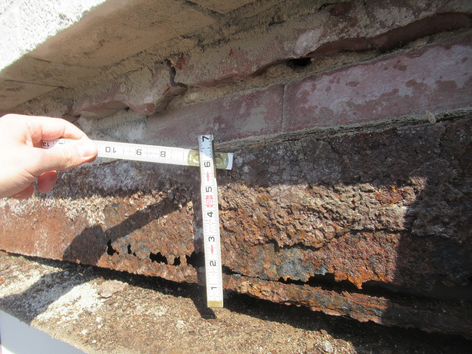 To investigate the source of water infiltration, WJE performed site visits to survey the locations of existing water damage on the replaced interior plaster finishes, observe inspection openings in the interior plaster, and observe an inspection opening at one second-floor window lintel on the south facade. Based on WJE’s observations, the majority of water-damaged and stained areas on the interior finishes generally corresponded to severely corroded steel window lintel locations as well as a few isolated areas where severely deteriorated mortar joints existed in the brick masonry.