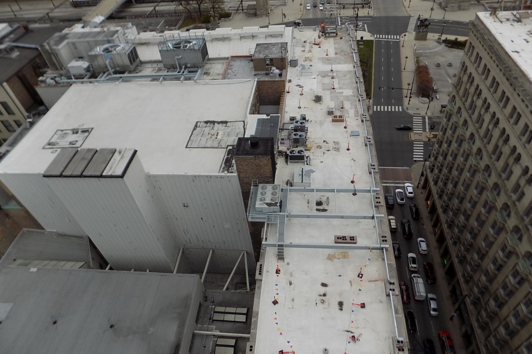 To provide OSHA-compliant facade access and fall protection at the Roosevelt University Auditorium Building, WJE performed the following services: