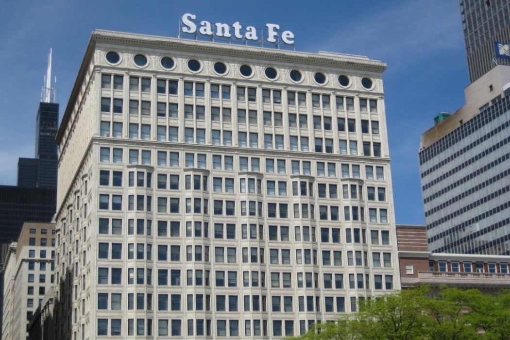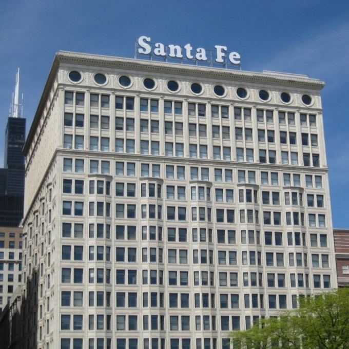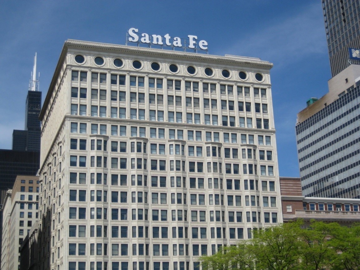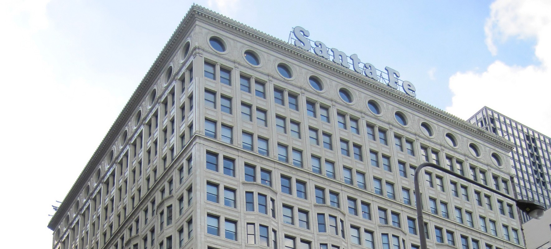 Originally known as the Railway Exchange Building, the Santa Fe Building was designed by Daniel Burnham and constructed in 1904. Located at the intersection of Jackson Boulevard and Michigan Avenue, the building measures approximately 172 feet by 172 feet in plan. The building is sixteen stories with an attic at the seventeenth floor and is clad with ornate terra cotta, metal windows, brick masonry, and a non-masonry material known as micro-cotta. A projecting terra cotta cornice extends around the east, west, and south facades of the building above iconic portal-like windows on the seventeenth floor.