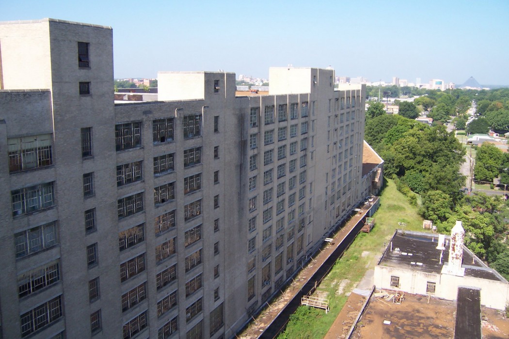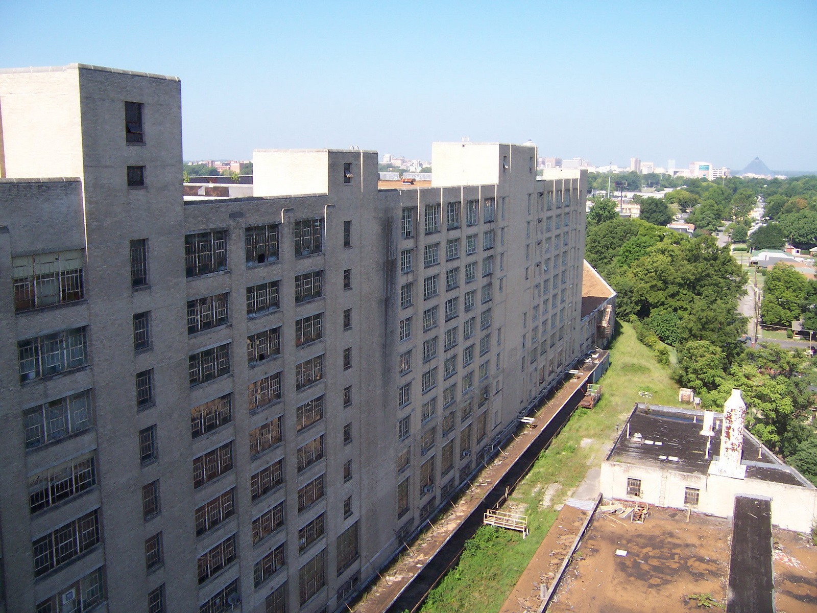 The Sears Crosstown was constructed in 1927 as a warehouse and catalog distribution center. Several additions were completed through 1965 and increased the building to 1.4 million square feet. The facade in the older portions of the building consists of mass brick masonry infill walls, while brick veneer with concrete masonry back-up walls are provided in the newer additions. The floor slab edge of the concrete-framed structure is partially exposed and forms the header for the window openings. Limestone accents are provided at window sills, parapets, and the top of masonry piers.