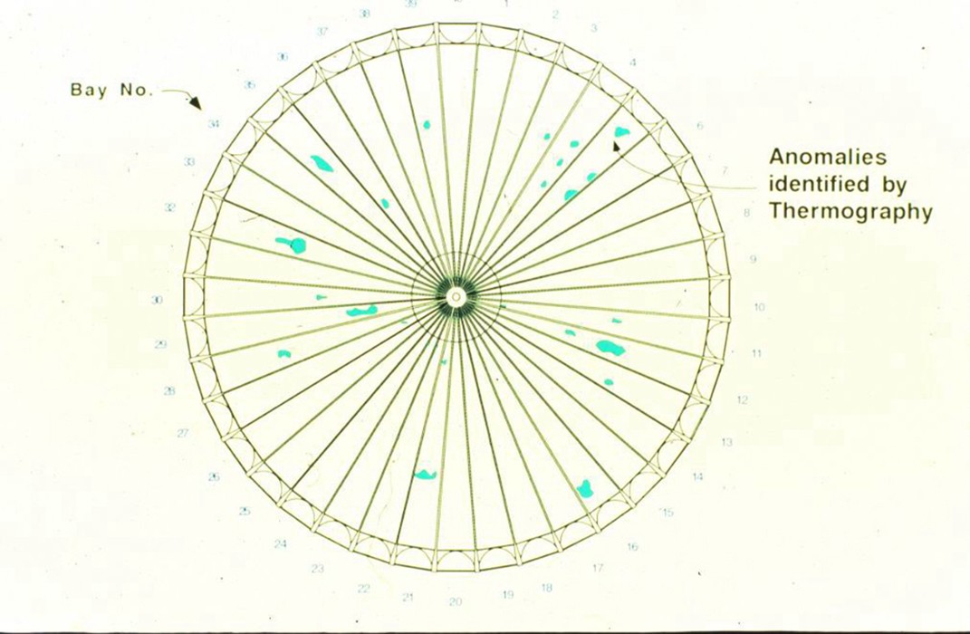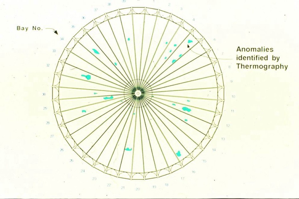 WJE initially performed close-up inspections and laboratory testing of the ceiling panels. After the concrete shell of the dome was exposed, WJE proceeded with a series of tests and evaluations to determine the extent and nature of voiding and consolidation deficiencies in the concrete shell. WJE performed nondestructive testing of the concrete, such as reflective ultrasonics and infrared thermography to survey the entire dome from the interior. Anomalous areas identified by infrared in the 5- to 18-inch-thick shell were evaluated with further techniques, including impact echo, exploratory openings and core sampling.