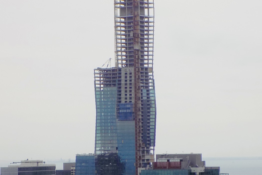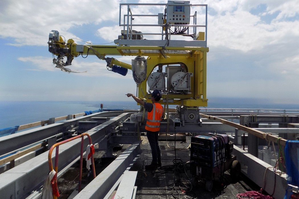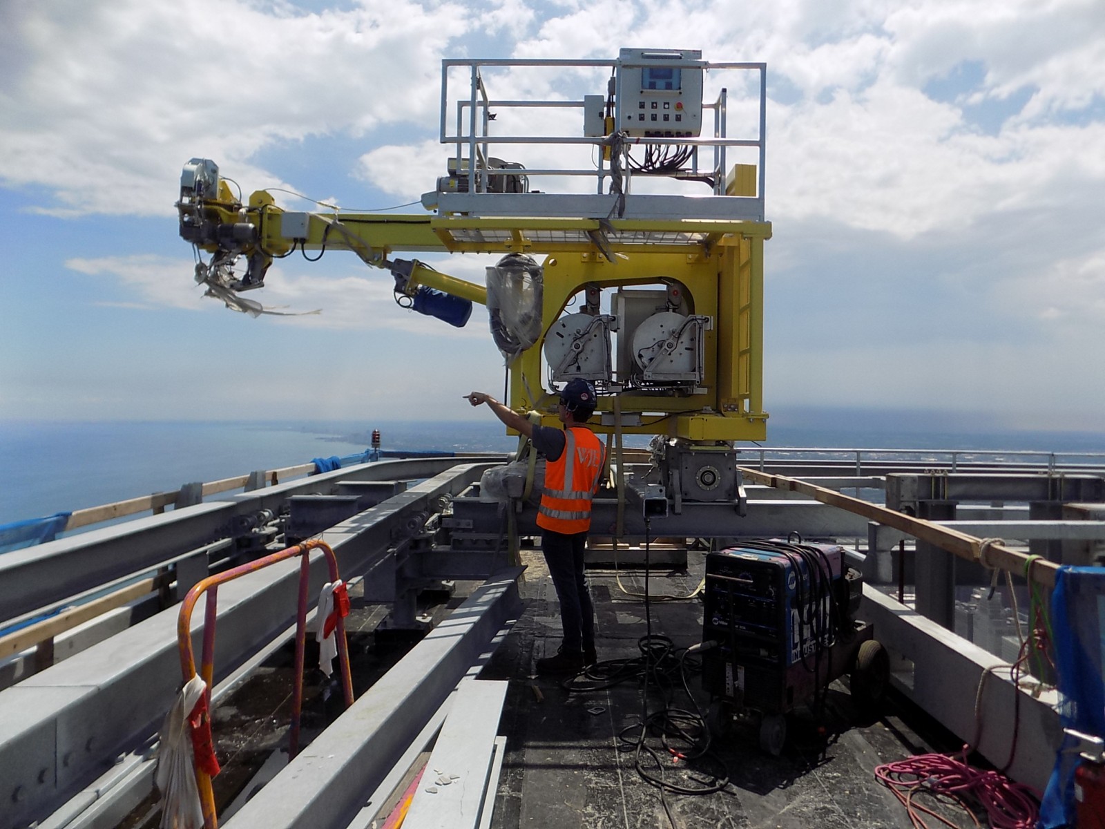 At Levels 47, 71, and 96, the facade access systems consist of building maintenance units (BMUs) that can traverse the perimeter of the roofs and suspend dedicated roof-rigged powered platforms. At Levels 10 and 11, a davit system is used to suspend a dedicated ground-rigged powered platform. Fall arrest anchorages are used for worker fall protection when erecting davits near roof edges.