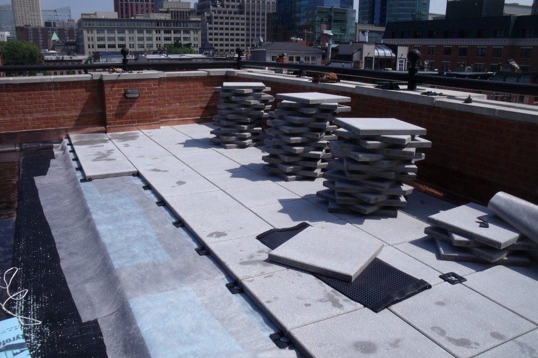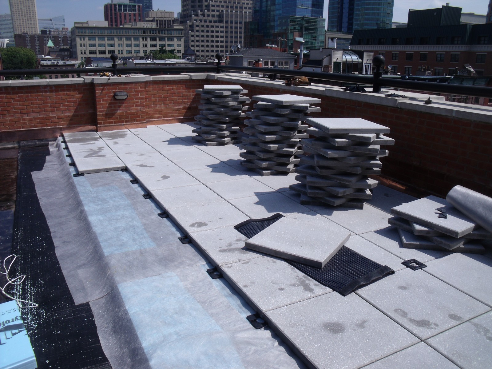 Sugar House is a four-story masonry building with a basement-level garage and fifth floor penthouses. The building was constructed as a two-story sugar warehouse in the 1860s. The top two floors and penthouses were added when the building was converted to condominiums in 2001. The addition included new masonry rising and parapet walls and new terrace waterproofing.