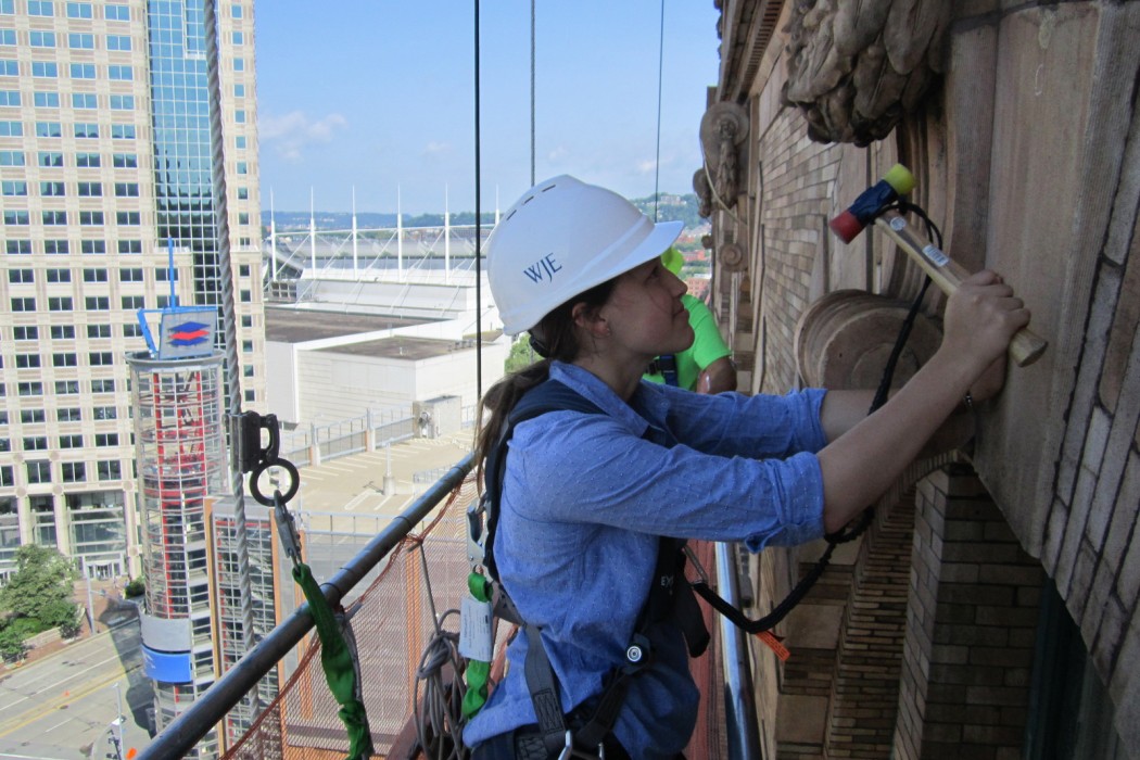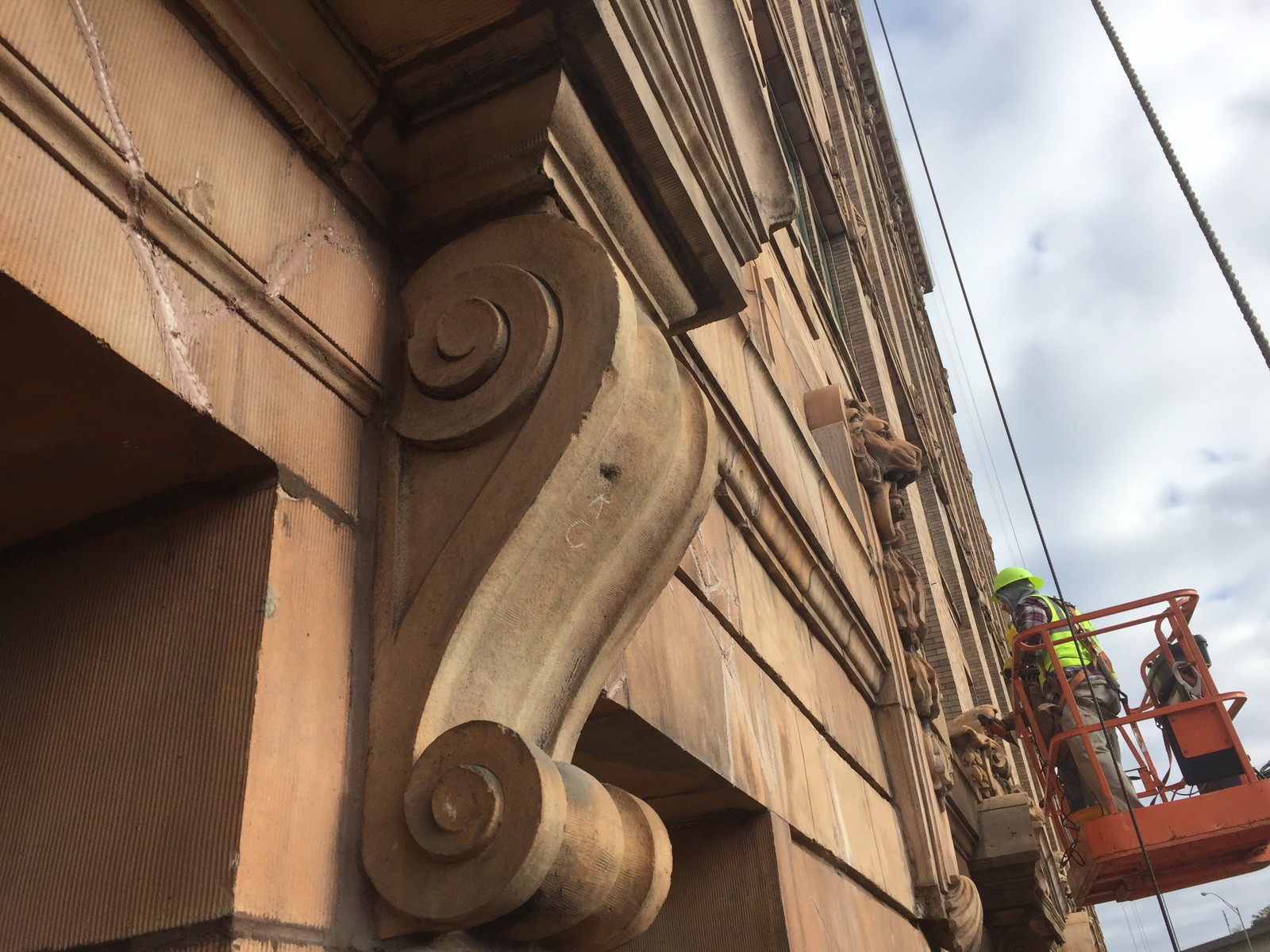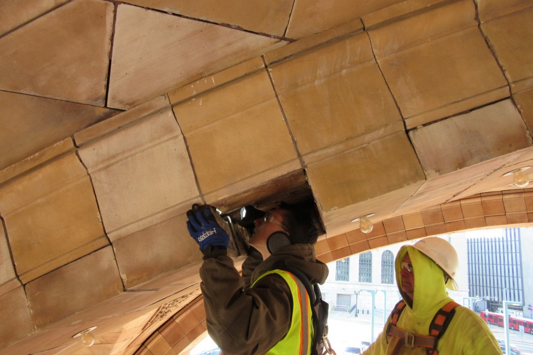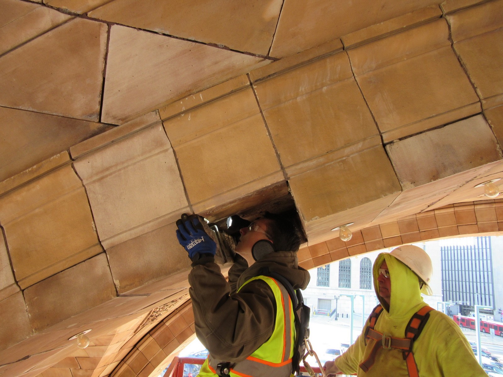The Pennsylvanian, located near the intersection of Liberty Avenue and Grant Street in downtown Pittsburgh, was constructed around 1900 and is a mixed-use building with apartments, offices, and below-grade parking. The main building is a steel-framed structure that is clad with a mix of terra cotta, brick, and stone. The rotunda is also a steel-framed structure clad primarily with terra cotta above the concourse level along with granite located at the base of the piers. A masonry contractor was engaged to perform various repairs and WJE was engaged separately to provide consultation during construction.
