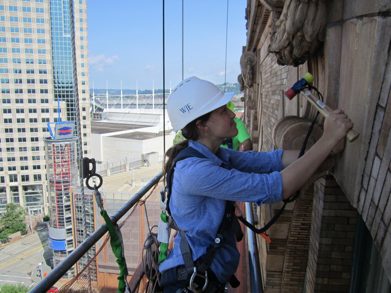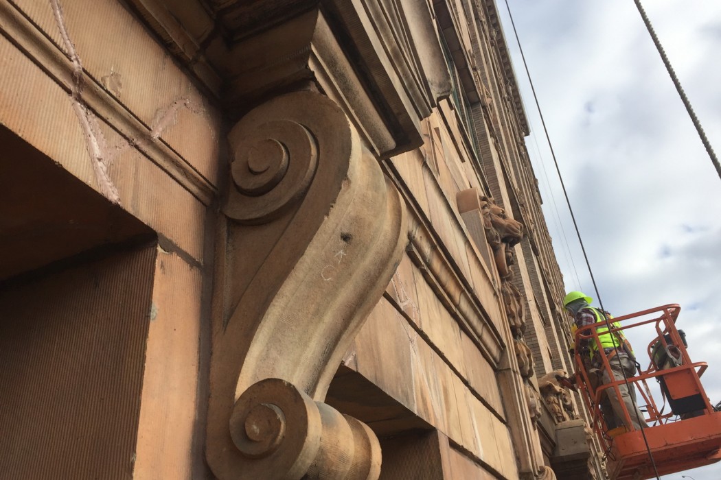 WJE reviewed the original construction drawings from 1900, additional renovation drawings from 1986, and relevant documents made available by Greystar. WJE observed existing site conditions to determine repair extents, and WJE findings and recommendations regarding repair details and approximate quantities were reported to Greystar. WJE also reviewed product submittals and performed regular construction observation site visits. Testing of installed materials was also performed, as requested by Greystar.