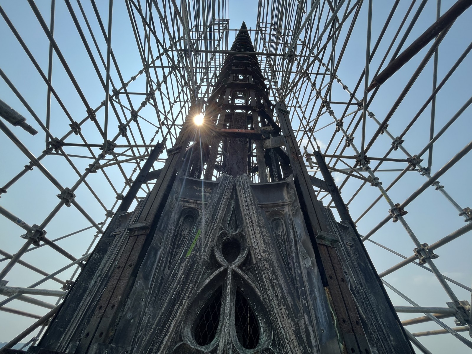 Multiple decorative grotesques had dislodged from the fleche, prompting WJE to access the full height of the structure from the interior as part of our facade ordinance inspection. Steel corrosion was found throughout the structure, including significant section loss at access platforms, panel connections, and structural gusset plates. In addition, panels were observed to have open seams, tears, and holes.