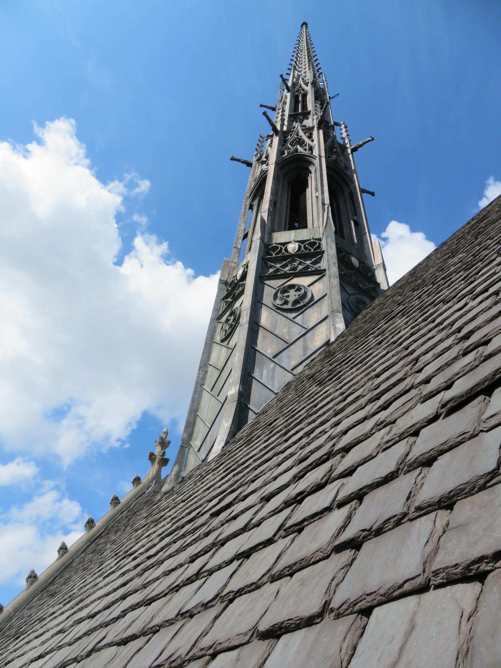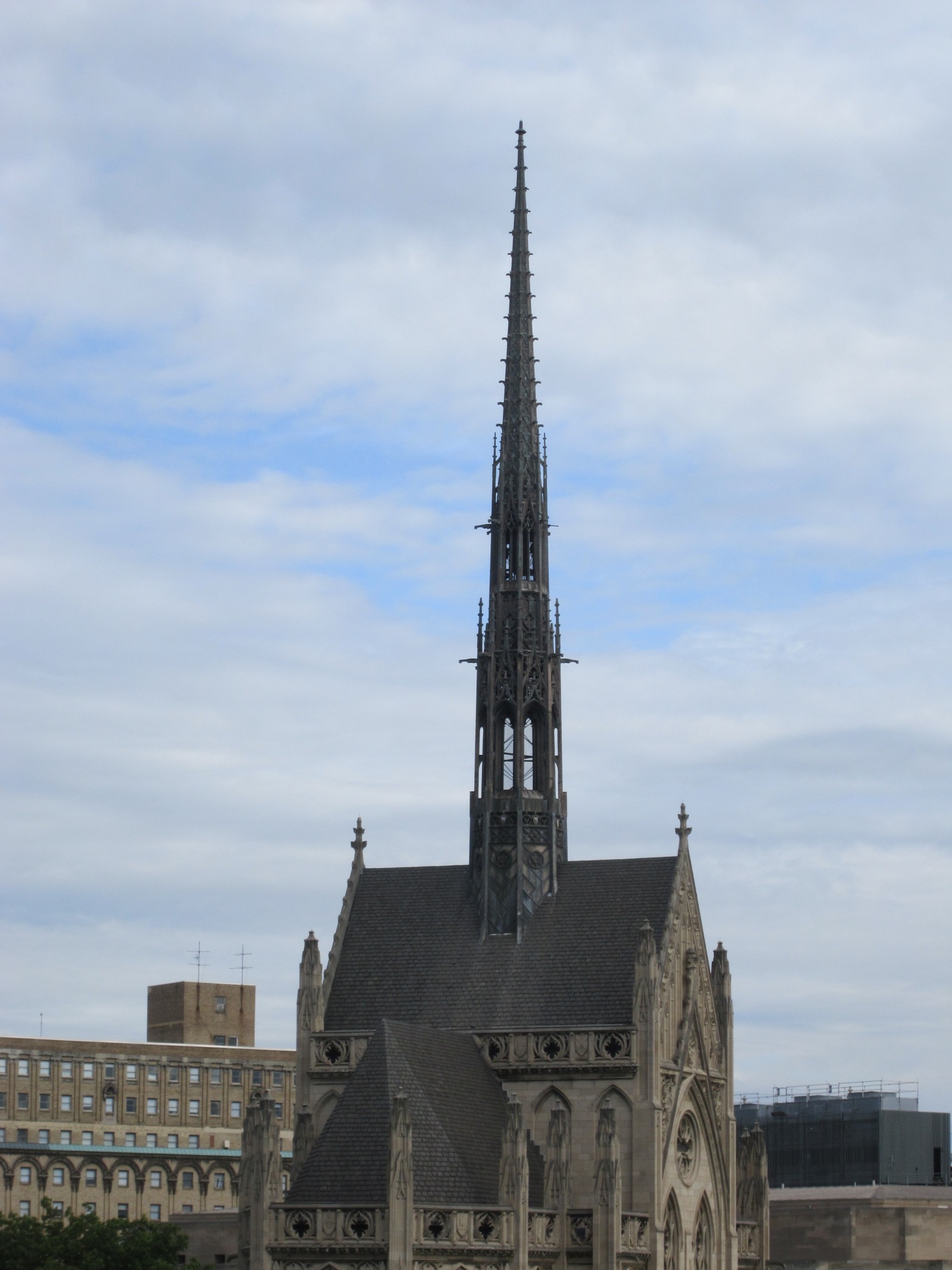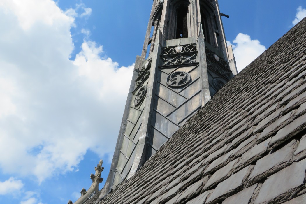 The neo-Gothic chapel is clad with grey Indiana limestone. The high roof is approximately 100 feet above ground and is covered with slate tiles. The lead-coated, copper-clad fleche extends approximately 120 feet above the ridge of the high roof.