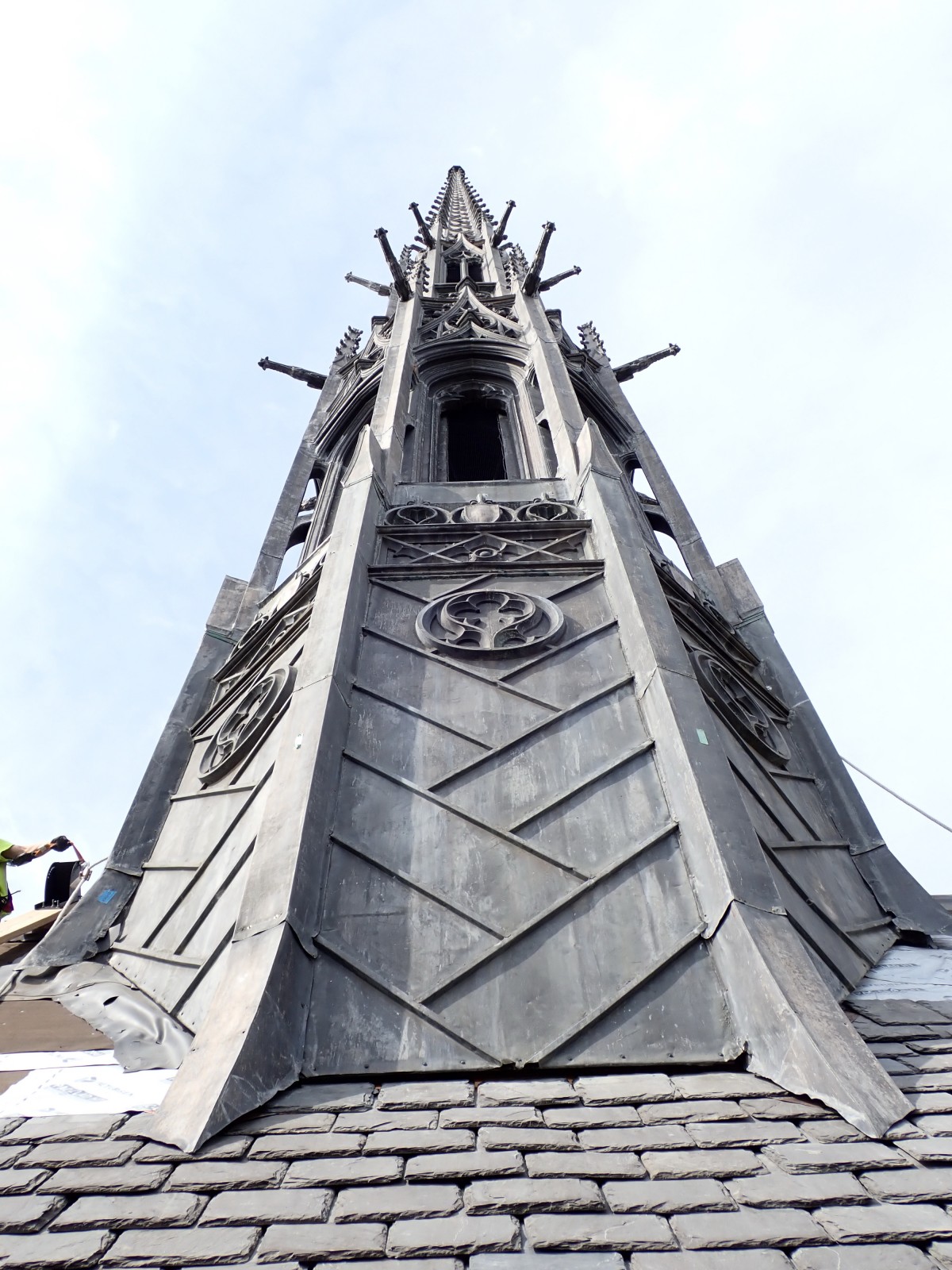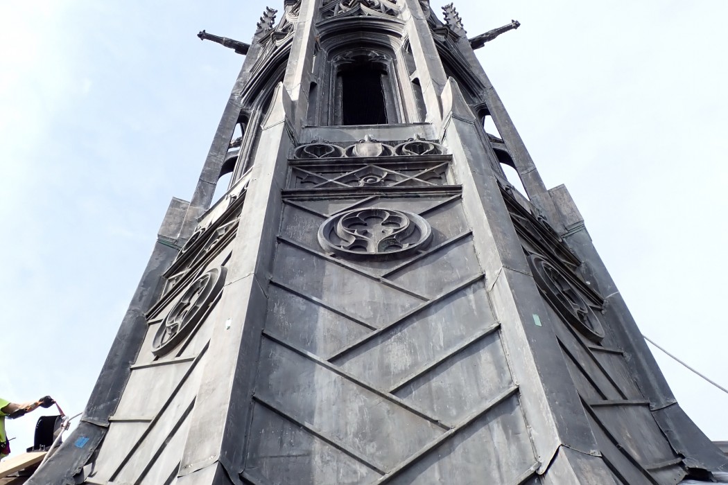 Following the identification of corrosion at the supporting steel armature of the fleche, WJE performed an extensive condition assessment of the structural system and the ornamental sheet metal cladding it supports. Full height scaffolding was installed to provide access, requiring the installation of new structural steel to reinforce the existing roof structure.
