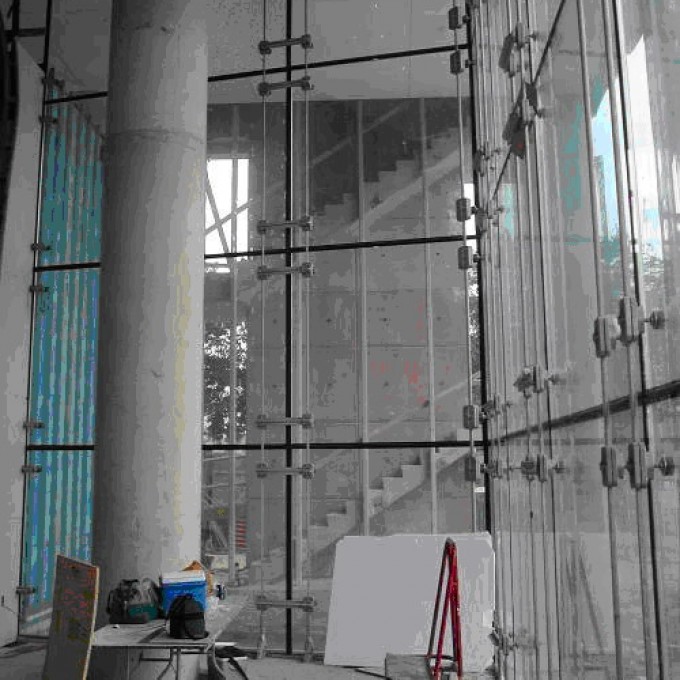Steel plates embedded in concrete beams served as the anchor points for high tension cables supporting a unique full-story glass wall system. Given their critical function, the WJE project team tested the embedded plates in a manner that would provide confidence in their ability to perform as intended.