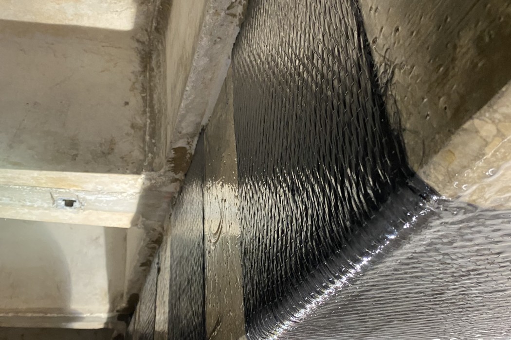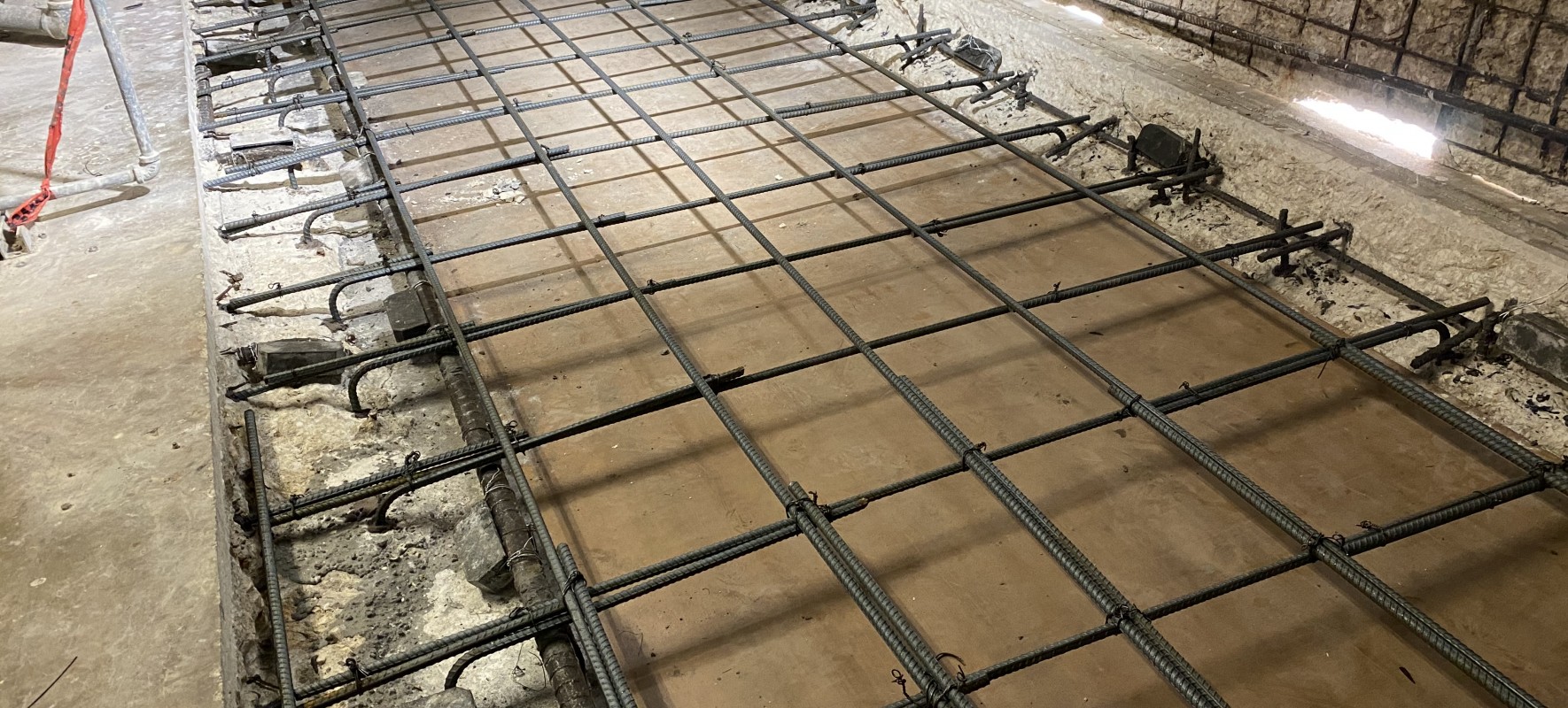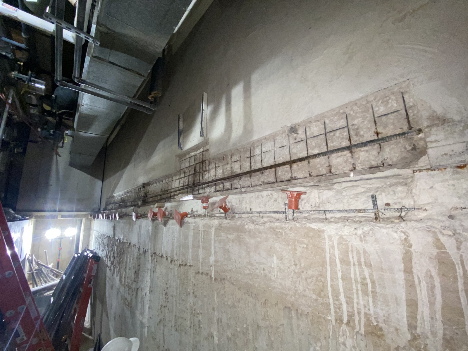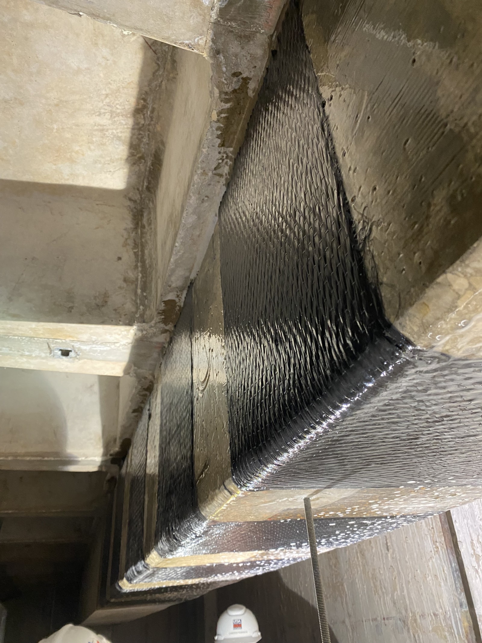 Based on this assessment, our repair design consisted of removal of all unsound concrete, including the entire slab and portions of the supporting beam, and cleaning of all corroded reinforcing. Carbon fiber-reinforced polymer was used to replace the compromised beam shear capacity around severely corroded shear stirrups, and galvanic anodes were used to protect the reinforcing steel from future corrosion.