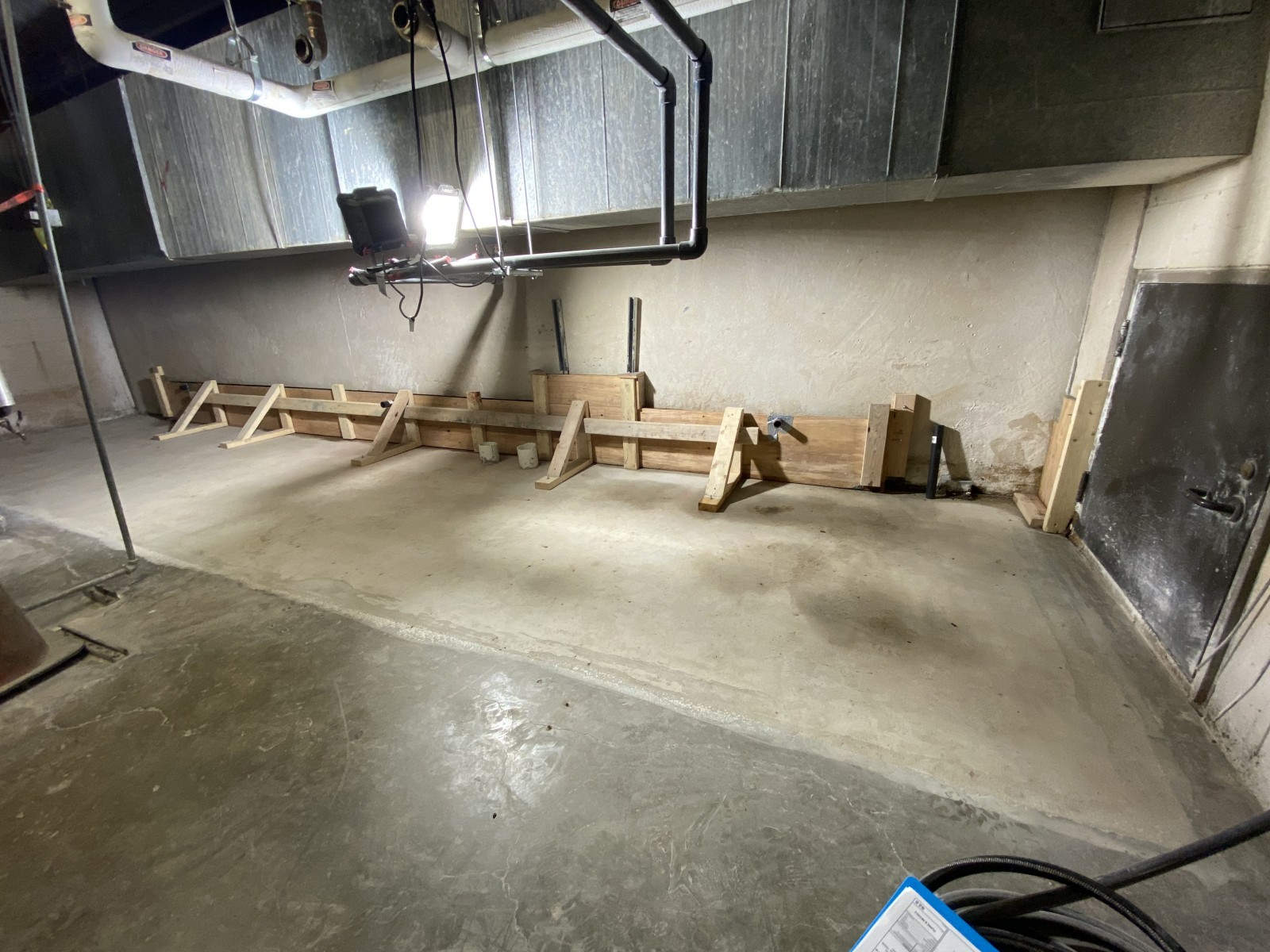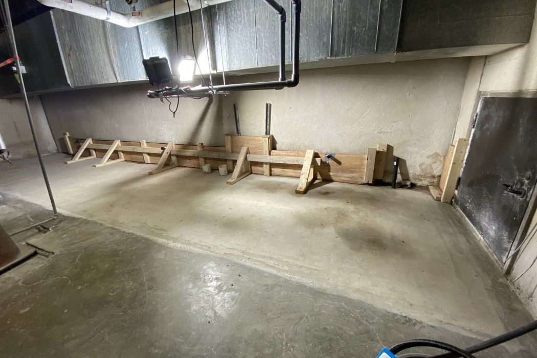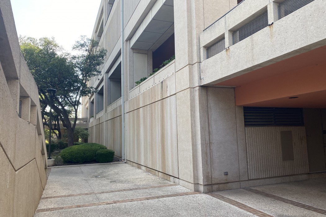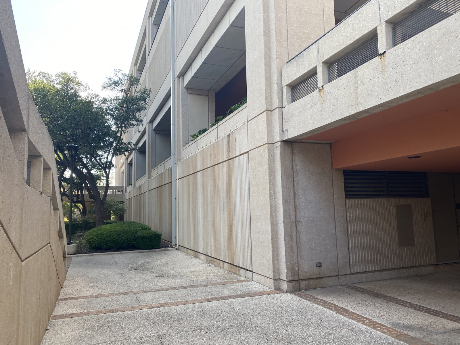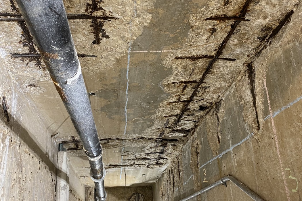 The UTSA Arts Building is a cast-in-place, reinforced concrete-framed building with exterior precast panels constructed in 1972. The first-floor mechanical room houses water softeners that were reportedly leaking and had been replaced. After the water softener replacement, the concrete floor around the water softeners was observed to be cracked on the top surface and spalled with areas of exposed and corroded reinforcing on its underside.
