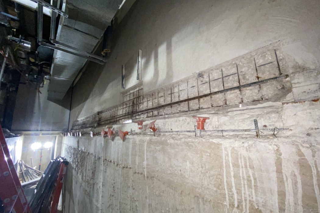 The client engaged WJE to provide assessment, repair design, and construction support services to determine the root cause of the distress and develop repair documents for construction. The observed distress consisted of spalled and cracked concrete on the floor surface, the supporting concrete beam below, and the precast concrete exterior wall panel. Areas of exposed and corroded reinforcement were also present.