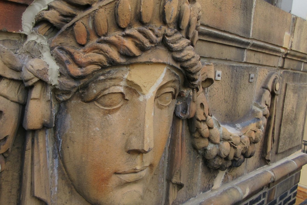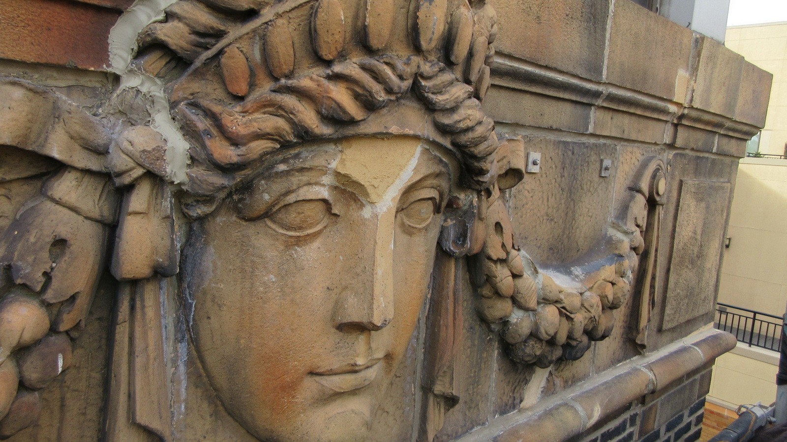 Constructed in two phases during the 1920s, the brick and terra cotta facade rises above a limestone-clad base. While most of the original architectural ornament remains intact, the terra cotta balconettes were significantly deteriorated from years of weathering and deferred repairs and maintenance. Some balconettes had been modified to accommodate through-wall HVAC sleeves, while others had been removed from the facade.