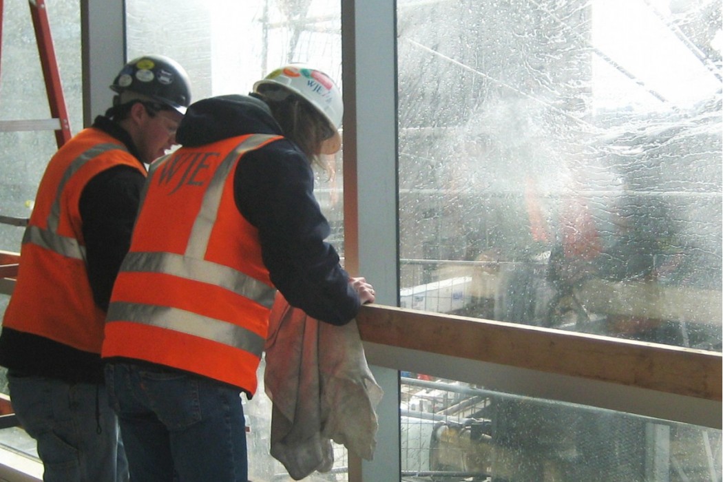 WJE services began with design phase peer reviews. As the project progressed into construction, WJE undertook a comprehensive commissioning approach to the building enclosure. This consisted of the development of a building enclosure commissioning specification; laboratory mock-ups and performance testing; submittal reviews; field quality coordination seminars for the contractors; building enclosure checklists; on-site construction observations and documentation; and building enclosure commissioning meetings and follow-ups. Field testing to validate the performance of the various building enclosure systems and components was undertaken by WJE staff with assistance from ATI.